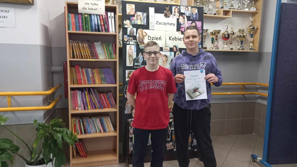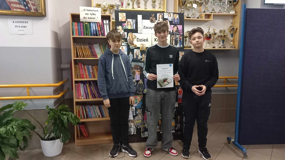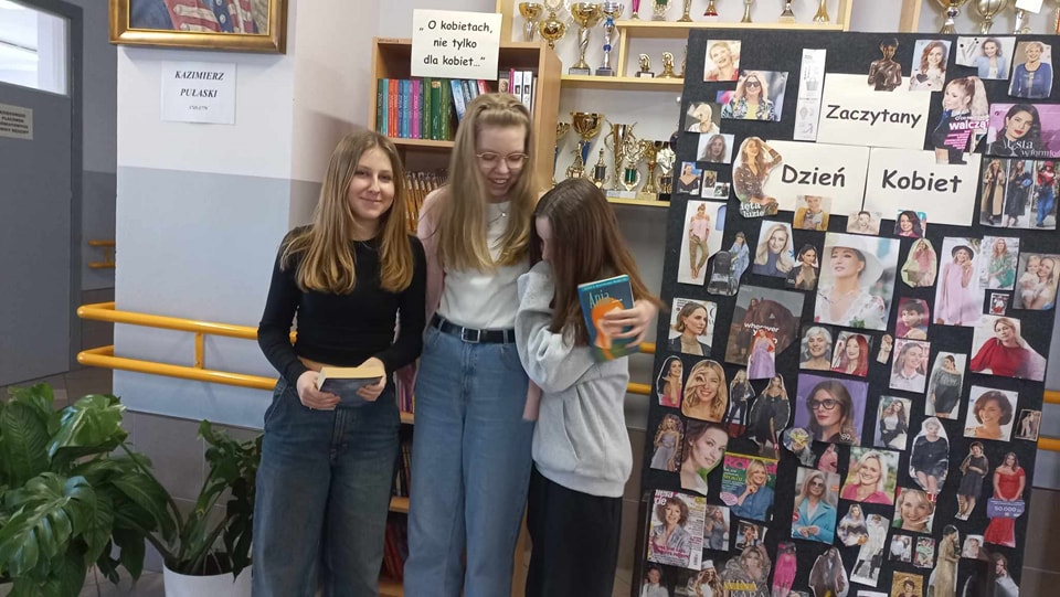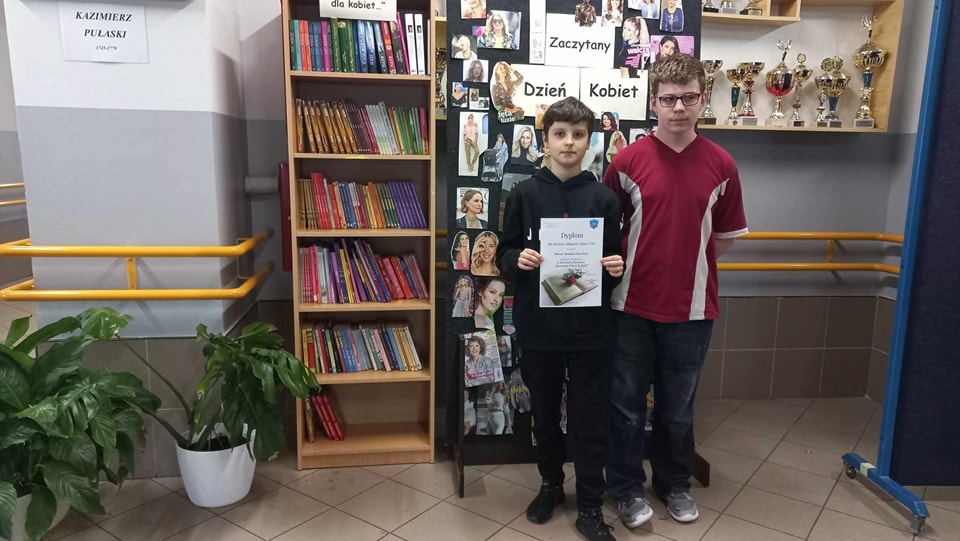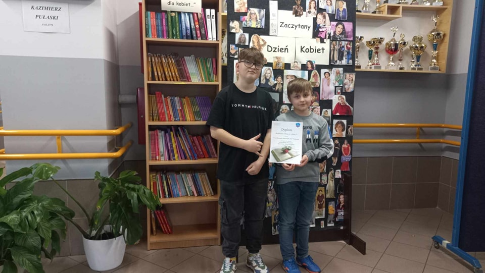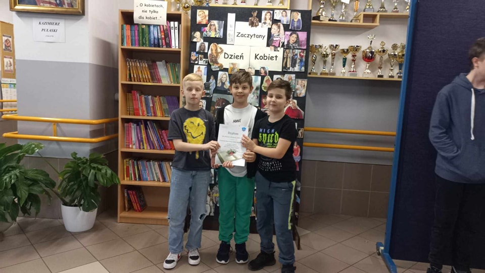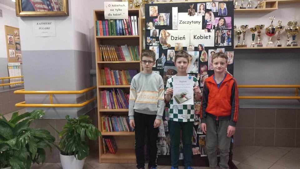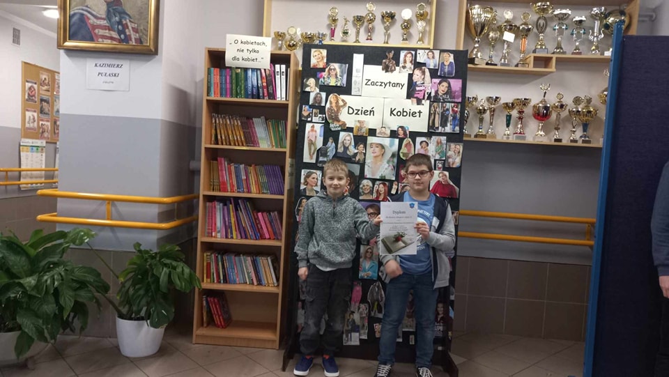 8 marca obchodziliśmy w naszej szkole Święto Kobiet pod znakiem książki. Z tej okazji książki „wyszły naprzeciw” czytelniczkom i czytelnikom. Na szkolnym korytarzu pojawił się specjalny regał z książkami zatytułowany „O kobietach, nie tylko dla kobiet”. Wśród książkowych pozycji znalazły się bajki dla najmłodszych o Calineczce, Kopciuszku czy Królowej Śnieżce. Nieco starsi czytelnicy mogli wypożyczyć przygody Ani z Zielonego Wzgórza, serię o Zosi z ulicy Kociej. Nie zabrakło podróżniczych opowieści Martyny Wojciechowskiej, ciekawych biografii kobiet, które zmieniły historię świata oraz przejmujących wspomnień dziewczyn z Powstania Warszawskiego. Równocześnie w tym dniu nauczyciel bibliotekarz zorganizował dla uczniów kl. II- VII szkolny konkurs czytelniczy ze znajomości książek, których bohaterkami są dziewczyny. Okazało się, że chłopcy, ponieważ to oni mogli być tylko uczestnikami konkursu, dobrze poradzili sobie z pytaniami. Doskonale wiedzieli kto zgubił pantofelek, kogo Gilbert Blythe nazywał marchewką i jak na imię miał kot Alicji z Krainy Czarów. Gratulujemy zwycięzcom konkursu i zapraszamy do wypożyczania nie tylko w Dniu Kobiet.