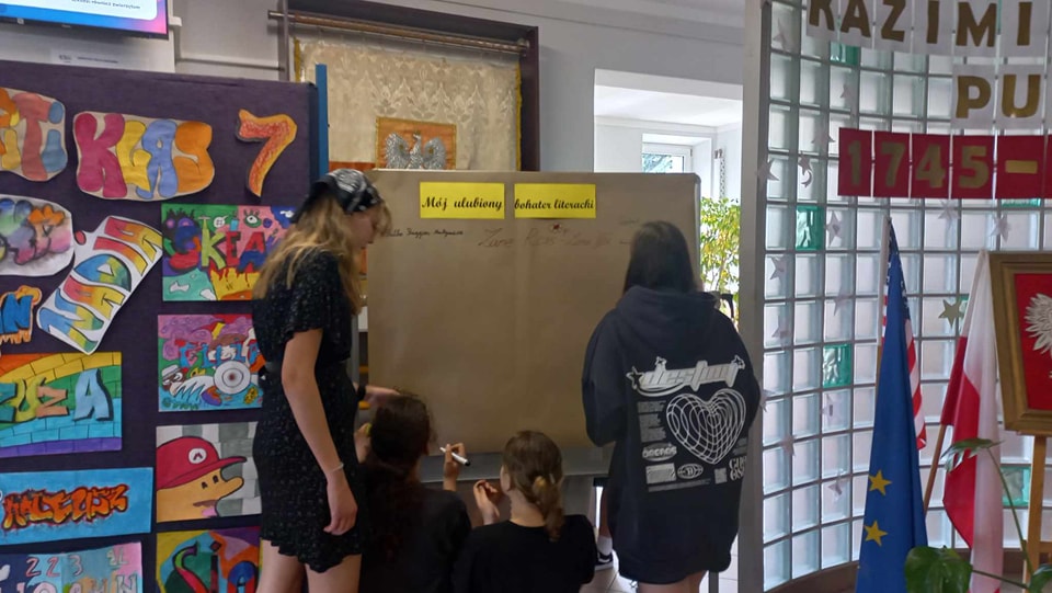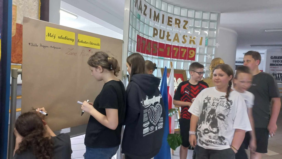 W maju obchodziliśmy święto biblioteki szkolnej. Z tej okazji przygotowano akcje skierowane do uczniów i nauczycieli. Uczniowie na tablicy umieszczonej w korytarzu szkolnym mogli zapisywać swoich ulubionych bohaterów literackich . Na tablicy pojawiły się postacie takie jak : Staś Tarkowski, Ania Shirley, Mały Książe, Kajko i Kokosz, Harry Potter, czy też Papkin. Uczniowie kl. VII b tworzący aktyw biblioteczny przeprowadzili wywiady z nauczycielami i pracownikami szkoły z zapytaniem o ulubioną książkę z czasów szkolnych. Efektem tego było „Drzewko czytelnicze”. Święto biblioteki uczcili również najmłodsi czytelnicy kl. I- III, ofiarowując nauczycielowi bibliotekarzowi własnoręcznie przygotowane laurki z życzeniami oraz deklaracjami, iż są przyjaciółmi książek.