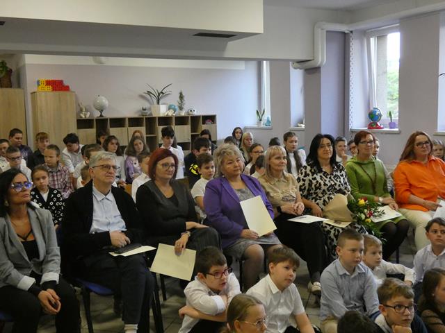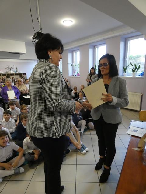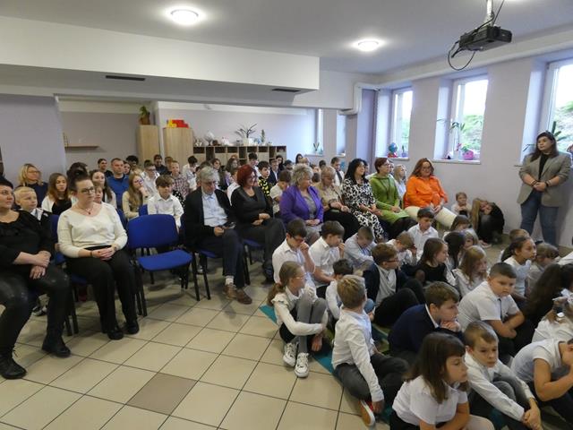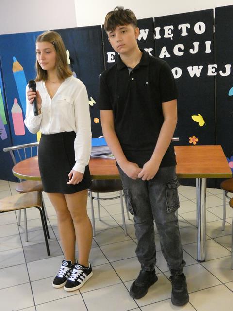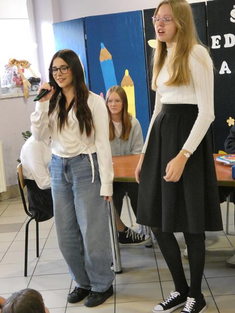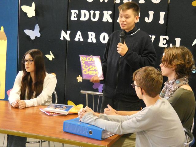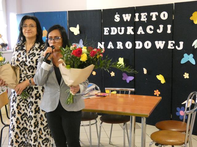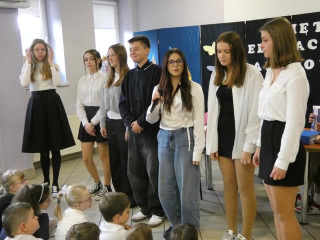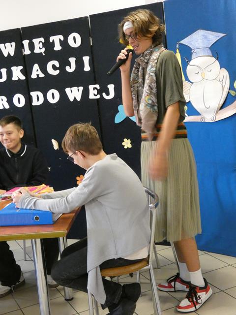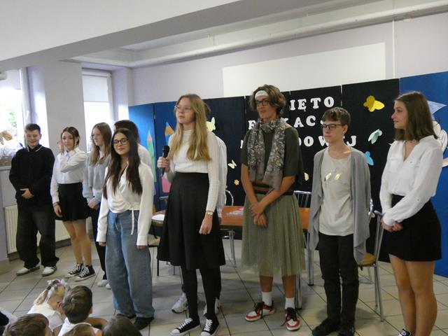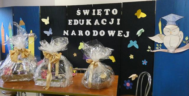 Jak co roku „Dzień Edukacji Narodowej” zgromadził całą społeczność szkolną, bo nic tak nie łączy ludzi, jak przekazywanie wiedzy. Uczniowie klas 8a i 8b, pod kierunkiem swoich wychowawczyń: p. Bożeny Migoń i p. Beaty Gulińskiej. przygotowali program artystyczny, który w wesoły sposób pokazał, jak wygląda od podszewki „pozalekcyjna” praca pedagogów. Chociaż program był niejako radosną satyrą, to tak naprawdę odzwierciedlał codzienną rzeczywistość trudnej pracy nauczycieli. Całość programu dopełniły piosenki, jedna z nich w samo sedno trafiła z przesłaniem dla wszystkich „Ludzi Oświaty”, bo któż nie życzyłby im : „Szczęścia ile się da, miłości w bród, mądrych ludzi wokół” . Uroczystość była także okazją do nagrodzenia przez Panią dyrektor Agnieszkę Ryś nauczycieli i pracowników szkoły. Na zakończenie przedstawiciele Rady Rodziców zaprosili na specjalnie przygotowany na tę uroczystość wspaniały tort.