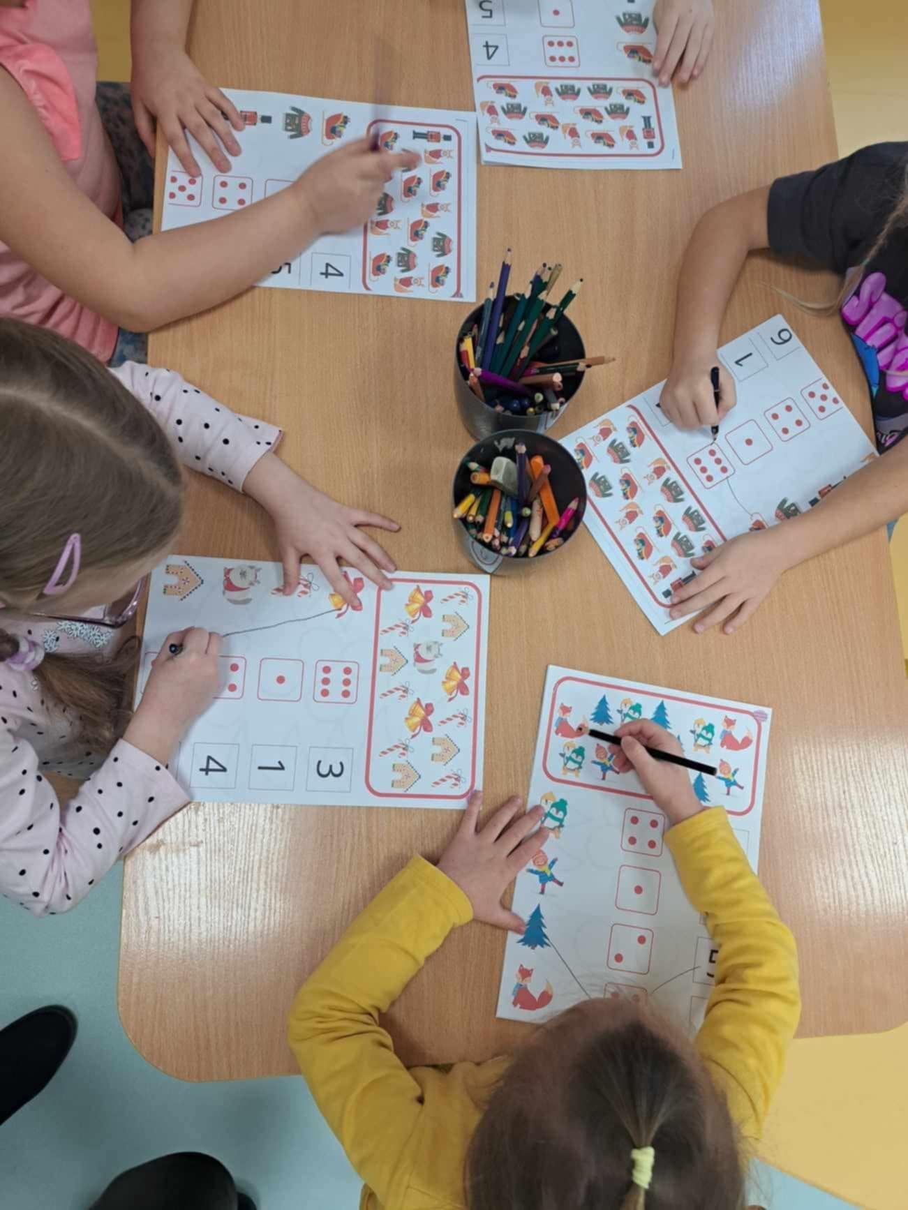 Dnia 3 grudnia w grupie 6 latków odbyły się zajęcia otwarte dla rodziców przygotowane przez wychowawcę grupy mgr Dorotę Kromołowską. Dzieci z wielką radością wyczekiwały niecodziennych gości - rodziców i panią wicedyrektor Dorotę Łukasik. "Świąteczna matematyka" to zajęcia związane z umiejętnościami matematycznymi dzieci. Mądre główki rozwiązywały zadania matematyczne, kodowały renifera, utrwalały cyfry i świetnie liczyły. Na zakończenie zajęć dzieci ozdabiały pierniczkowego ludzika.