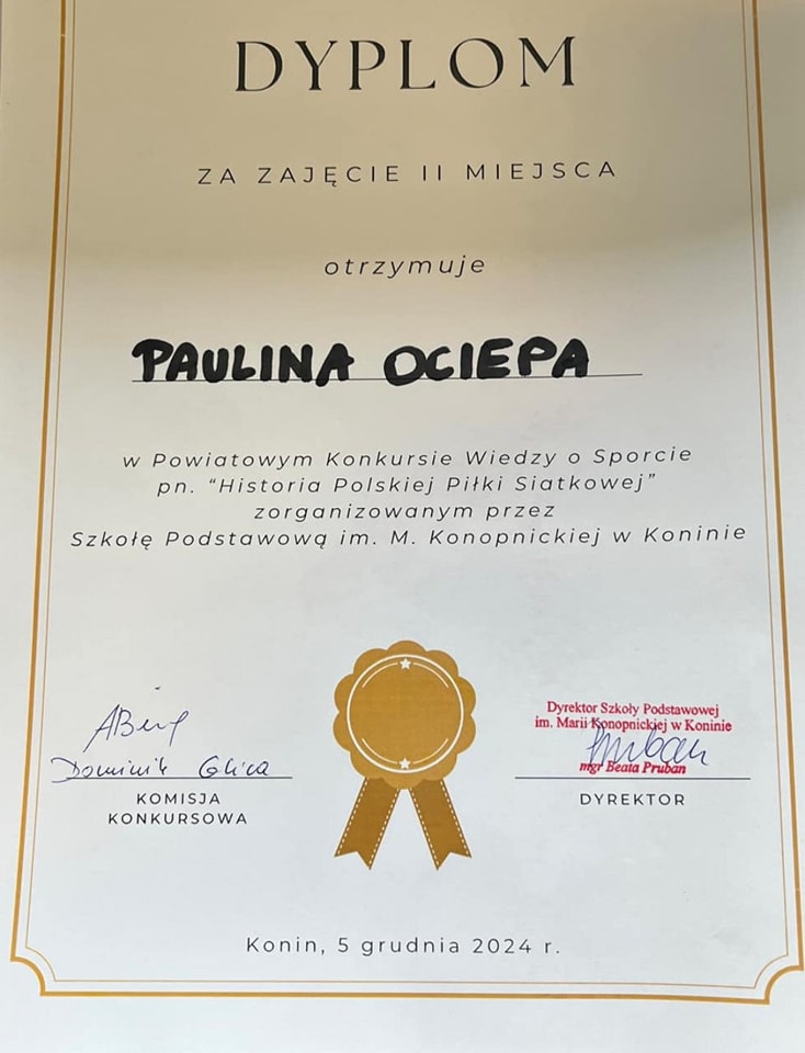 Serdeczne gratulacje dla uczennicy kl. 8b Pauliny Ociepy za zajęcie II miejsca w Powiatowym Konkursie Wiedzy o Sporcie pn. "Historia Polskiej Piłki Siatkowej" zorganizowanym przez Szkołę Podstawową im. M. Konopnickiej w Koninie. Jeszcze raz gratulujemy i życzymy dalszych sukcesów!