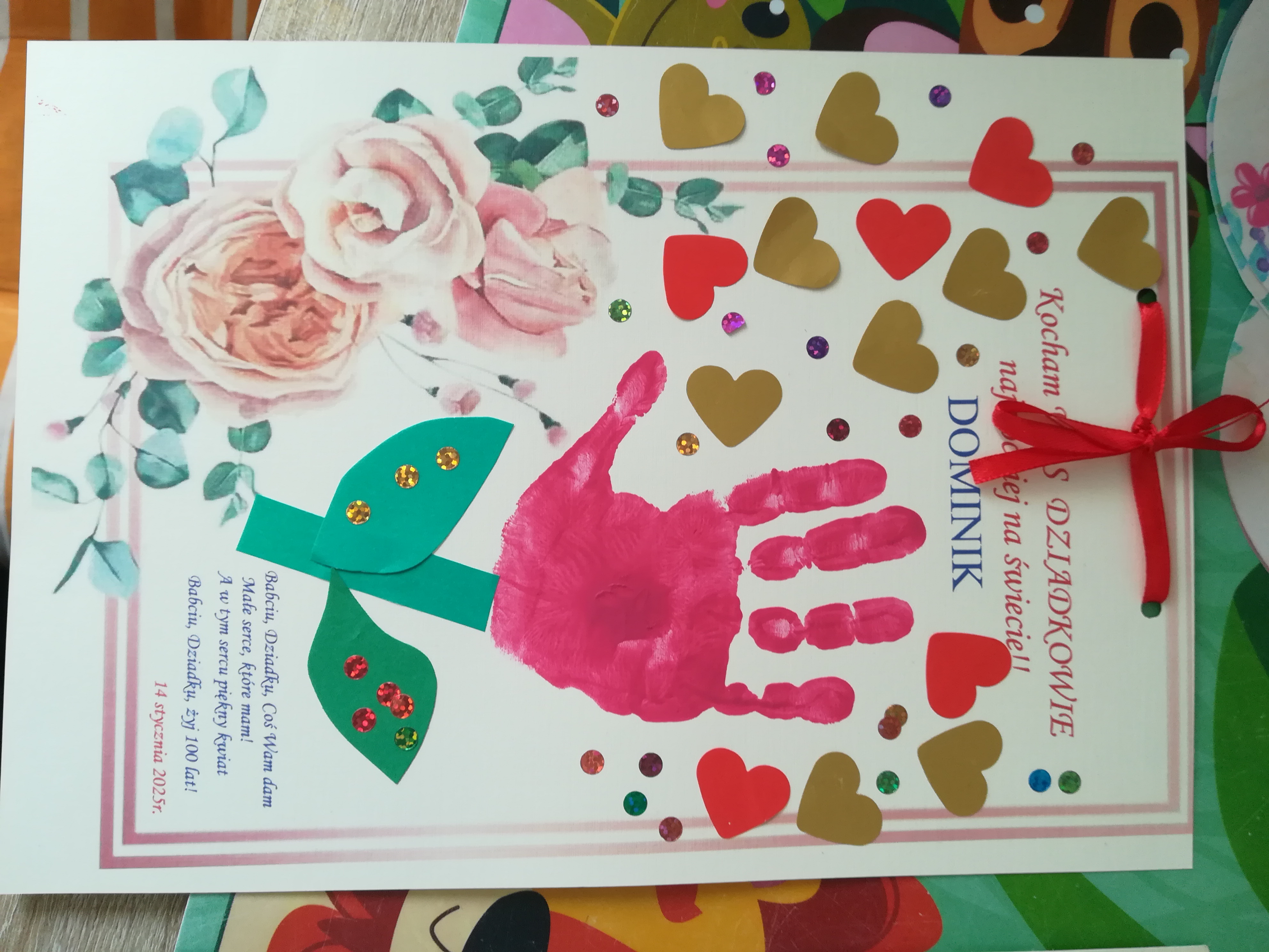 Babciu, Dziadku, Coś Wam dam! Małe serce, które mam! A w tym sercu piękny kwiat, Babciu, Dziadku, żyj 100 lat!