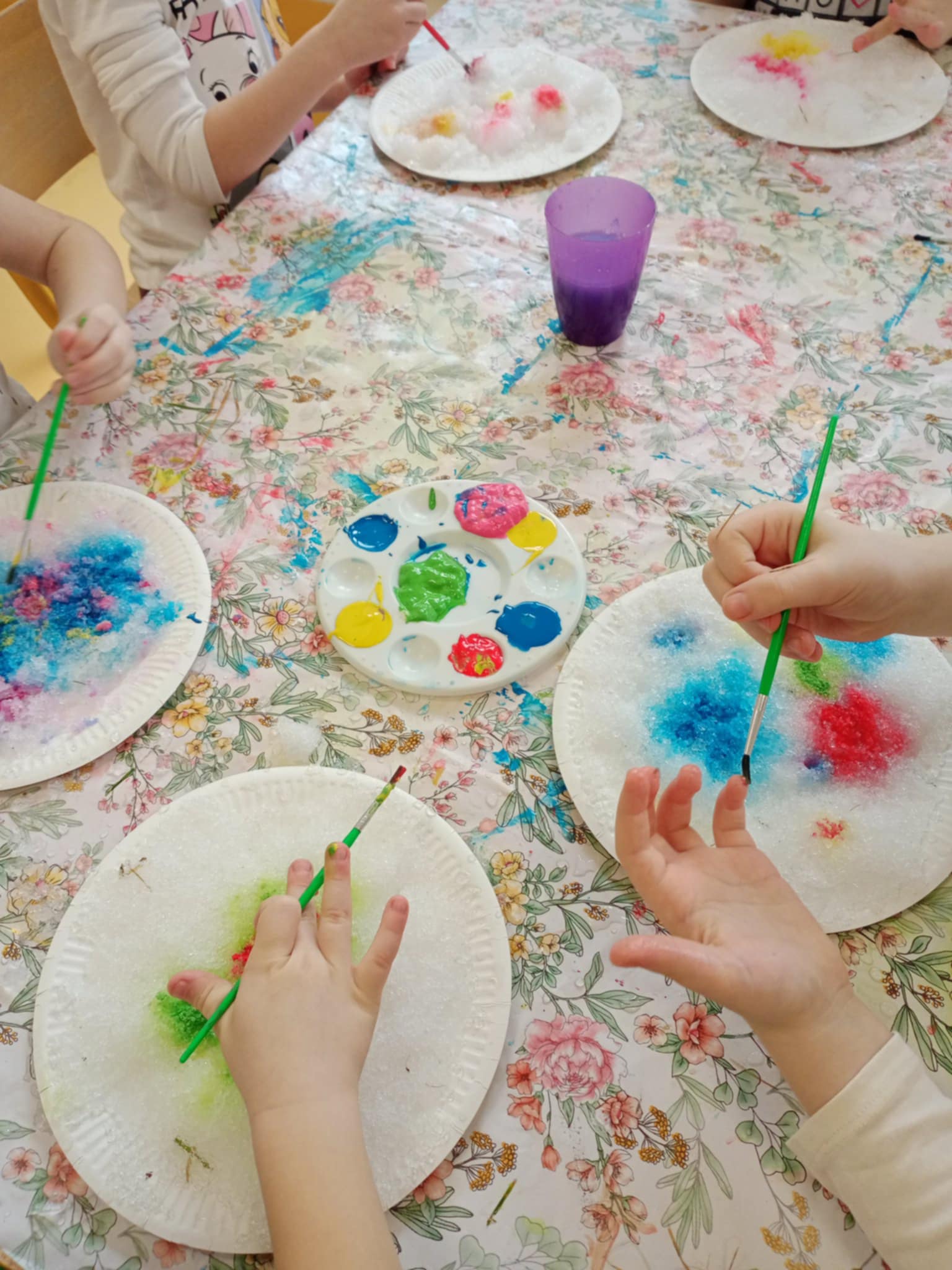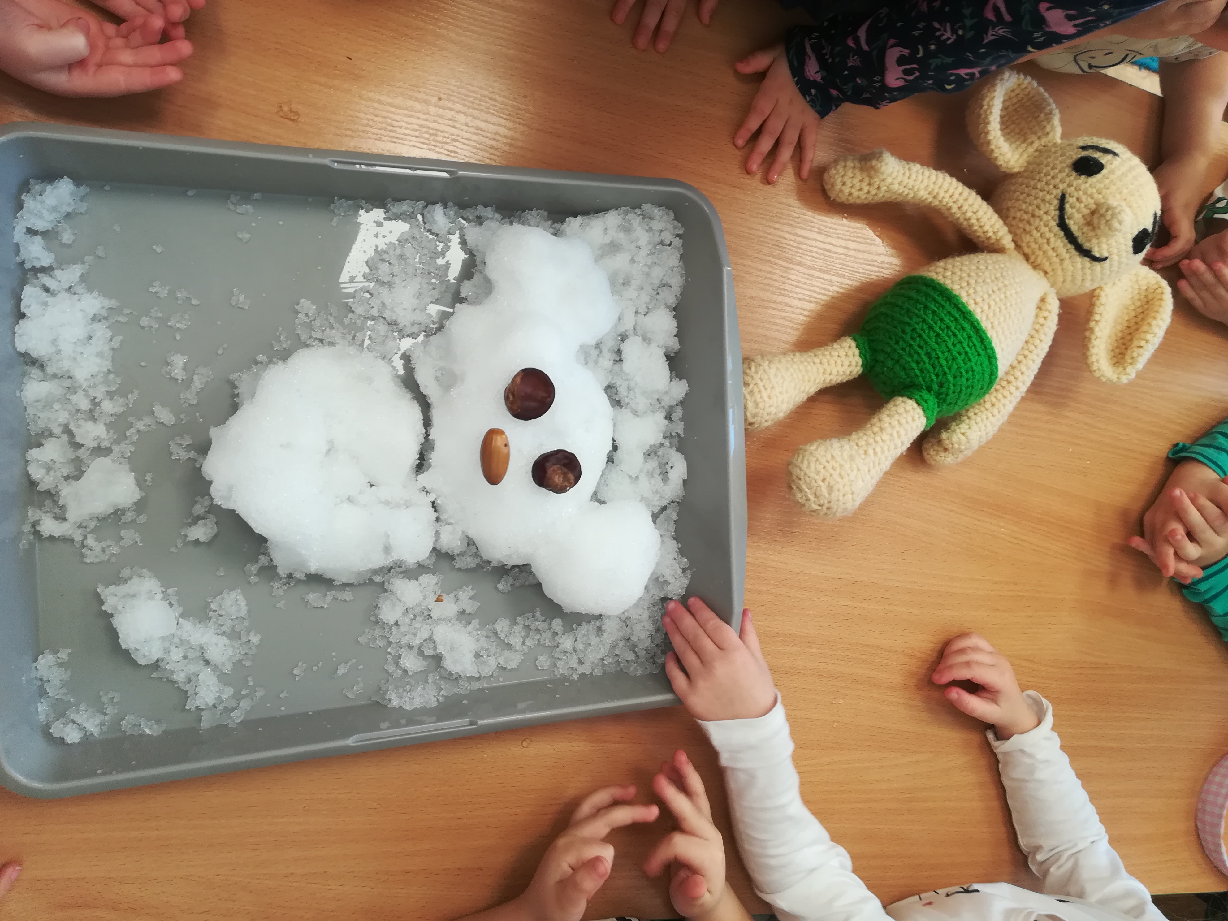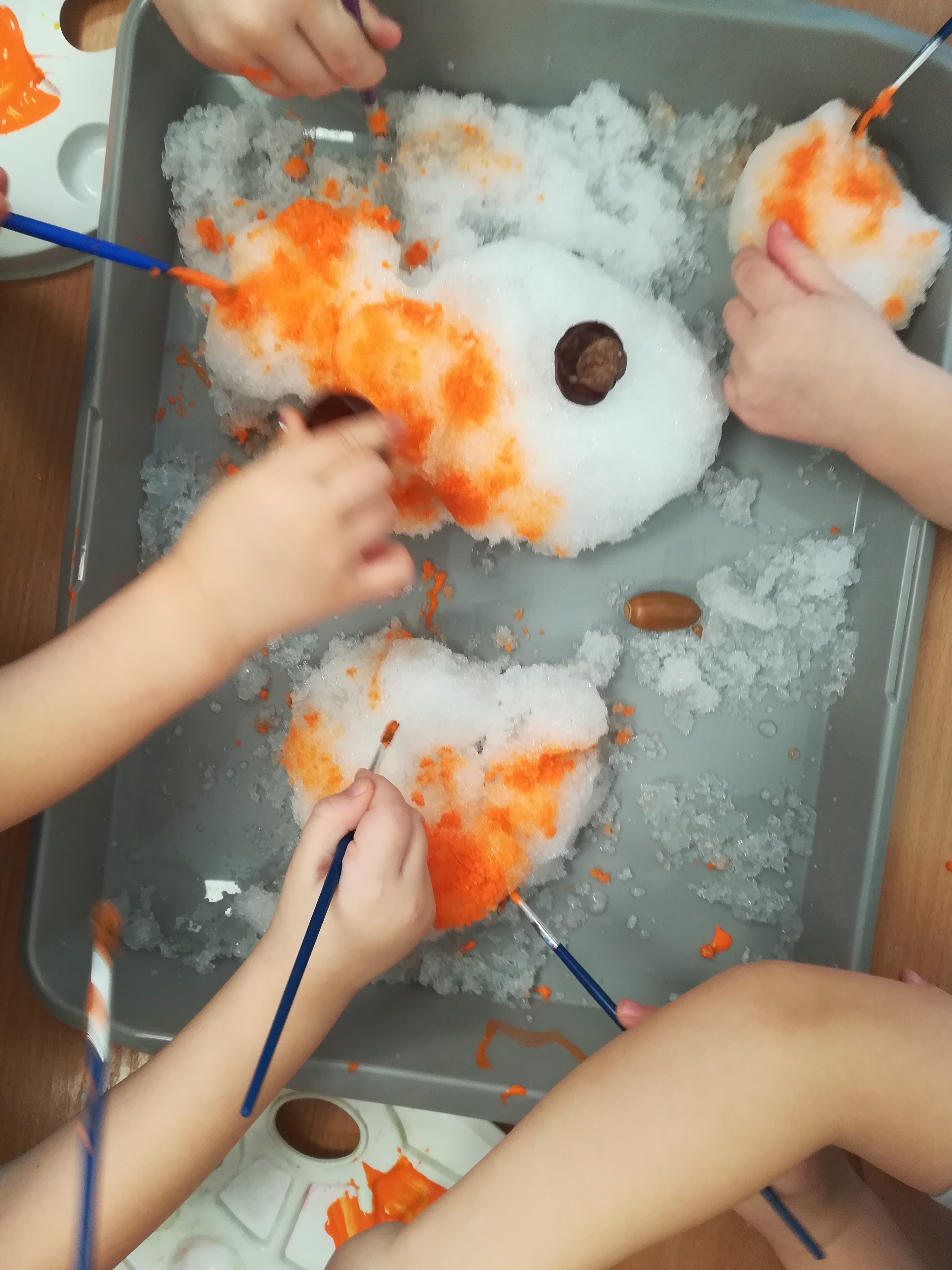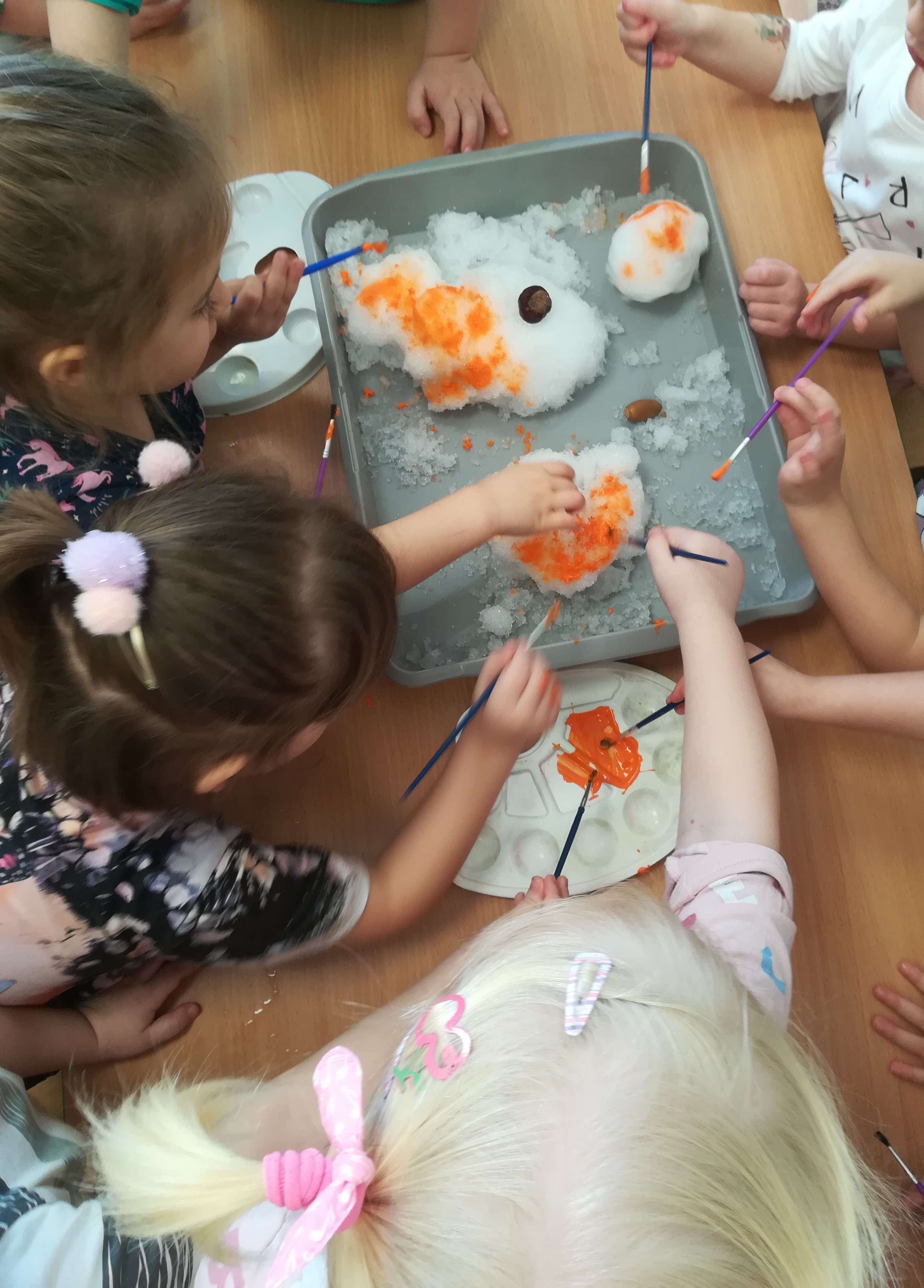 Na zajęciach badawczych przedszkolaki eksperymentowały ze śniegiem i poznawały jego właściwości. Okazało się, że jest on bardzo zimny, biały i mokry, a pod wpływem wyższej temperatury rozpuszcza się. Co można ulepić ze śniegu? – wiadomo!!! Kulki śniegowe, bałwanka a nawet Plastusia! Przedszkolaki przekonały się również, że śnieg nie musi być tylko biały, a może być na przykład pomarańczowy albo kolorowy. Malowanie śniegu okazało się suuuper zabawą!!!davdavdavdavdav