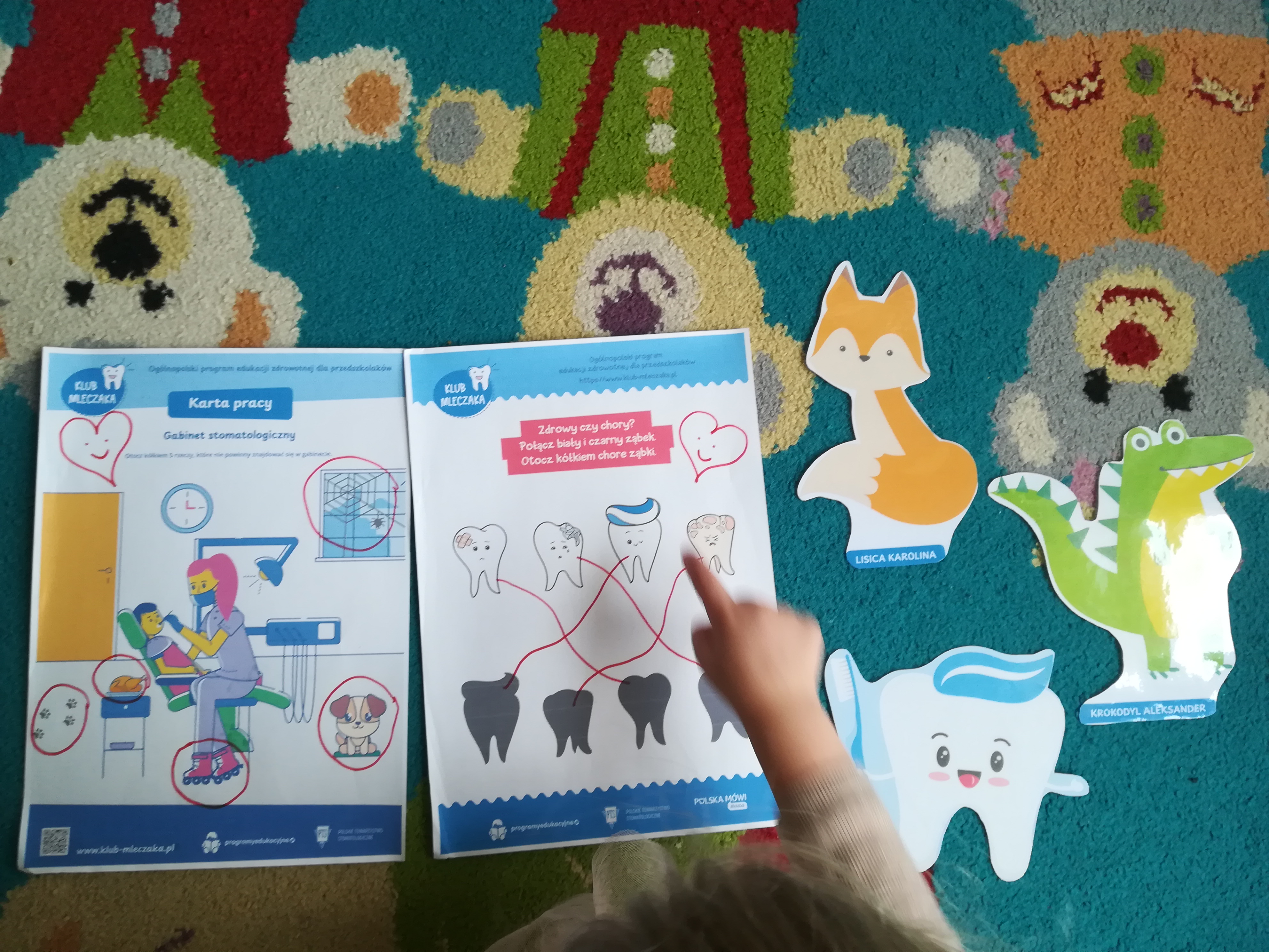 A przy okazji wzbogaciły wiedzę na temat zdrowego odżywiania i dbania o własne ząbki. Dzieci rozwiązywały karty pracy „W gabinecie stomatologicznym”, „Piramida Żywienia”, „Chory czy zdrowy ząbek?”. Na koniec zajęć Maluszki zdobyły sprawność Lisicy Karoliny i wykonały kreatywne prace plastyczne.