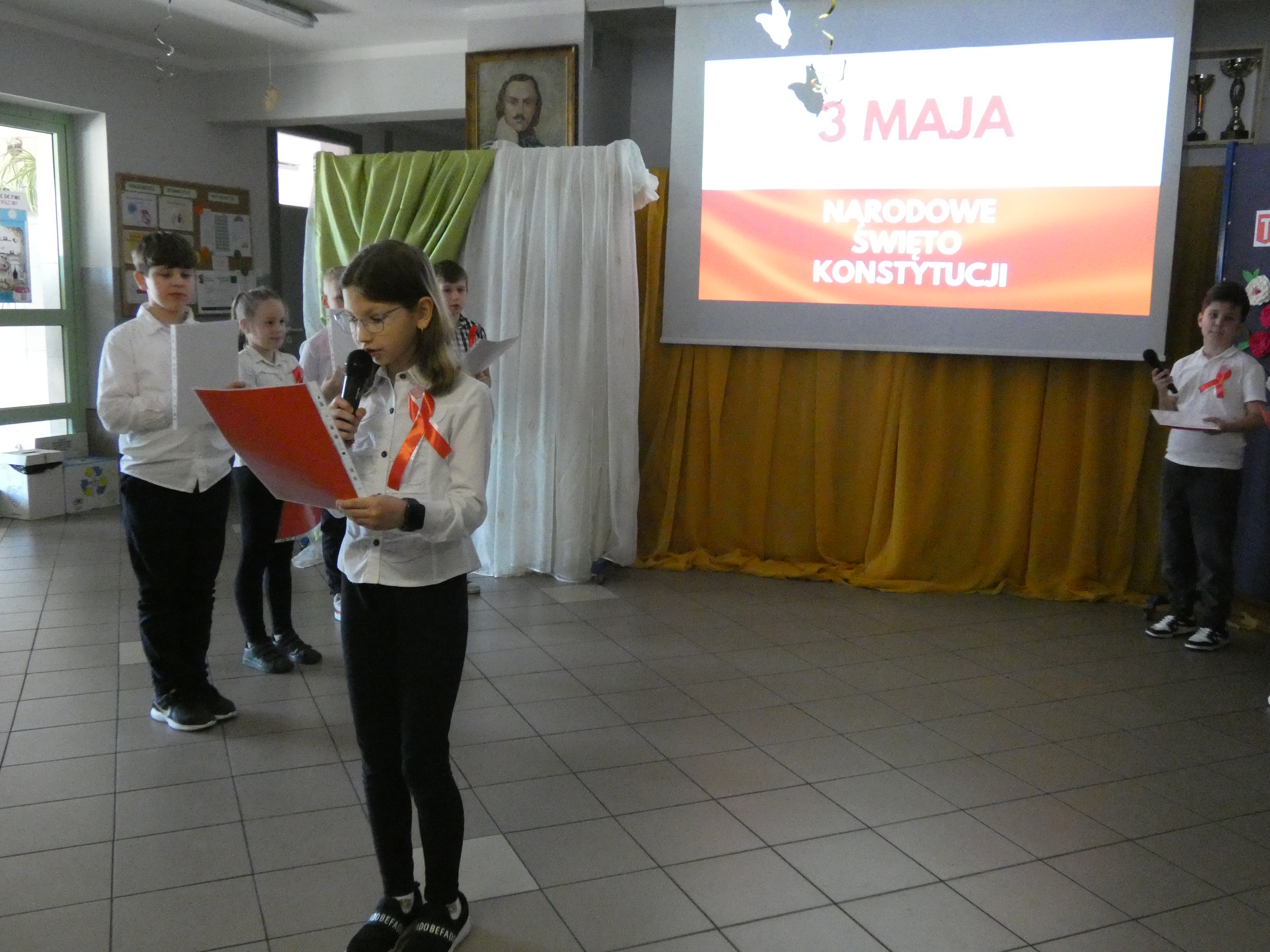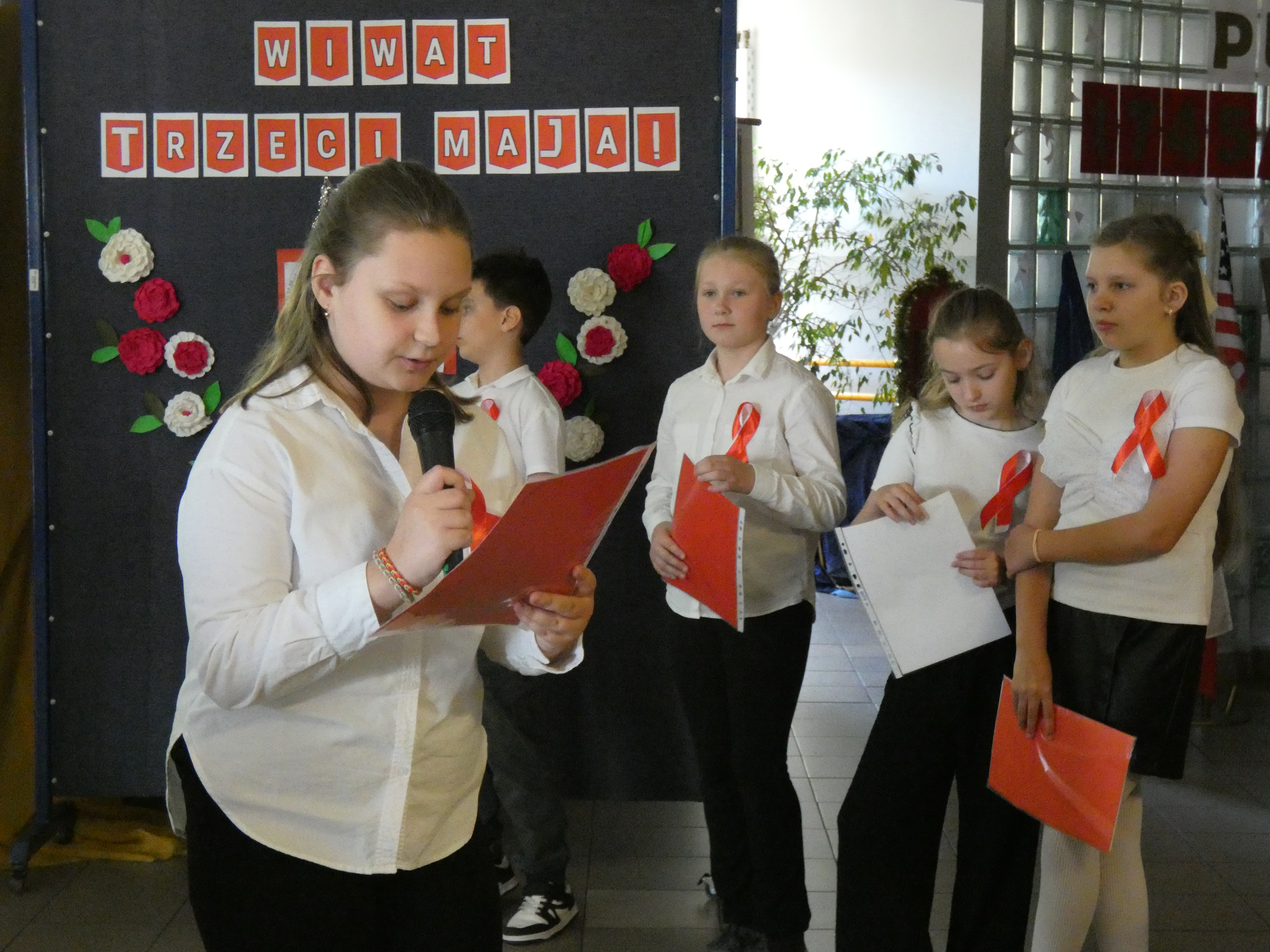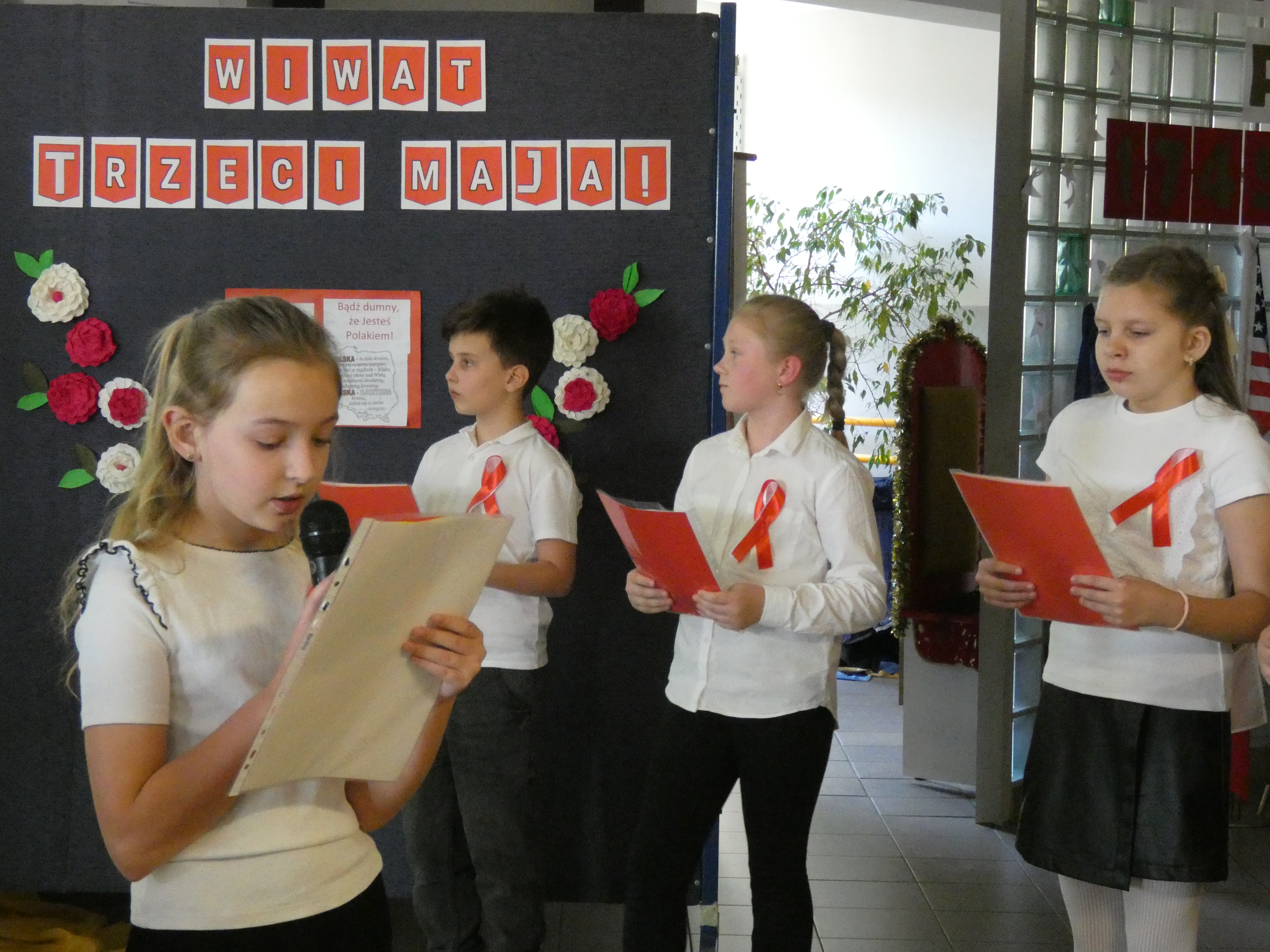 3 maja – cóż to za data? Dla setek młodych ludzi to jedna z wielu nic nie znaczących uroczystości. Ale czy tak powinno być ? Przecież naród, który nie zna swojej przeszłości, umiera i nie buduje dobrego „jutra”. Żyjąc w zwariowanym tempie dzisiejszego świata, zatrzymaliśmy się przez chwilę i wysłuchaliśmy krótkiej lekcji historii i patriotyzmu, przygotowanej przez klasę 4 pod kierunkiem wych. D. Łukasik. Zostały przypomniane ważne okoliczności towarzyszące powstaniu Konstytucji, tak ważnego dokumentu w dziejach naszej Ojczyzny, który do dziś nie stracił na wartości. Konstytucja 3 Maja 1791 roku była wówczas pierwszą w Europie, a drugą na świecie po konstytucji Stanów Zjednoczonych. Zawierała podstawowe zasady ustroju Polski. Konstytucja została symbolem możliwości odrodzenia, a w świadomości i sercach Polaków pozostała jako źródło siły i natchnienia. Uczniowie dali wyraz swojego patriotyzmu poprzez śpiew i recytację. Występ zakończył się piękną piosenką o Polsce: ,,Tu wszędzie jest moja Ojczyzna”.