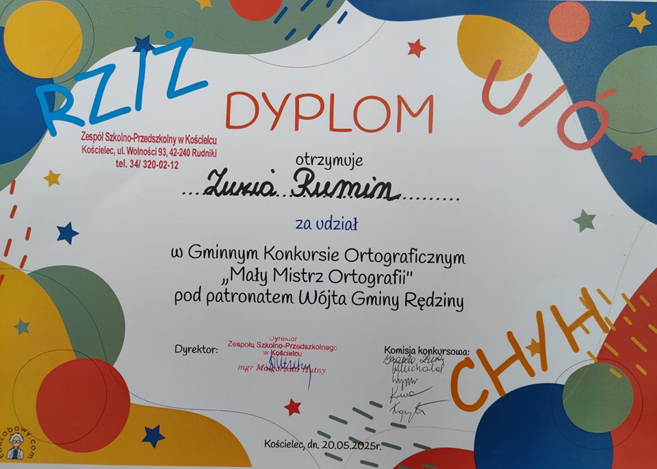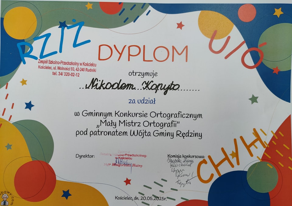 Serdeczne gratulacje dla uczniów naszej szkoły- Zuzanny Rumin (kl.2) oraz Nikodema Kopyto (kl.3), którzy wzięli udział w Gminnym Konkursie Ortograficznym "Mały Mistrz Ortografii" pod patronatem Wójta Gminy Rędziny, zorganizowanego przez Zespół Szkolno-Przedszkolny w Kościelcu. Brawa dla naszych reprezentantów, którzy pokazali, że ortografia nie jest im straszna.