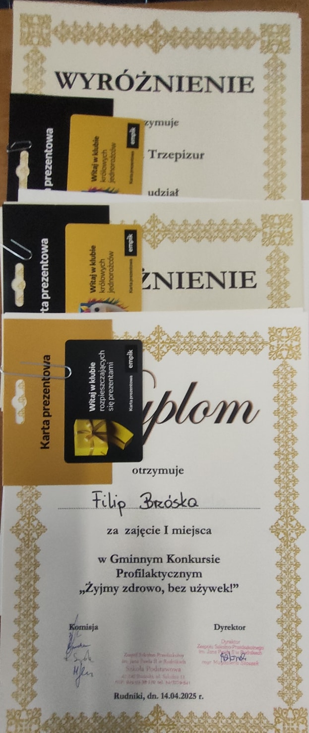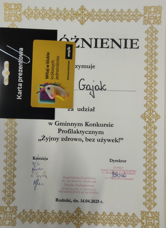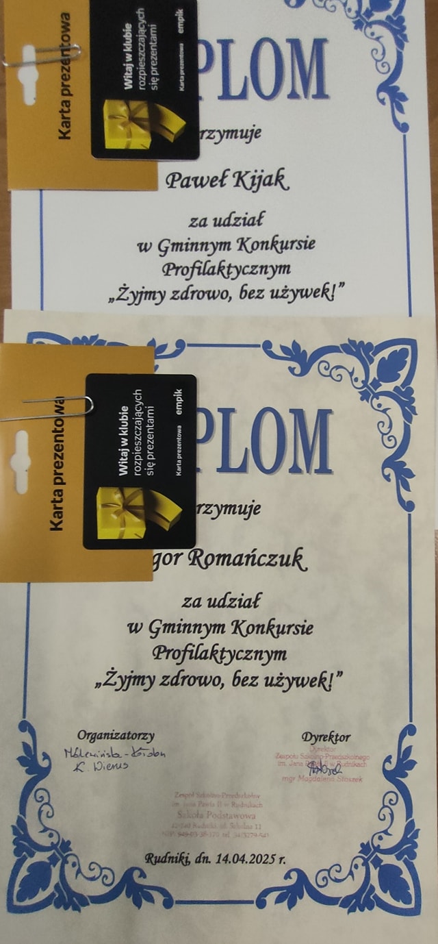 Nagrody w formie bonów prezentowych Empik oraz dyplomy zostały zasponsorowane przez Gminną Komisję Rozwiązywania Problemów Alkoholowych w Rędzinach.