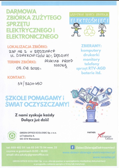 Chcemy poinformować, iż nasz zespół kolejny raz uczestniczy w akcji zbierania elektrośmieci. Zbiórka potrwa do 5 czerwca 2025 r. Zachęcamy do wzięcia udziału w akcji jeśli posiadacie Państwo zbędny i zużyty sprzęt elektryczny lub elektroniczny prosimy o dostarczenie go do budynku szkoły przy ul. Działkowiczów 20 w Rędzinach (sprzęty o dużych gabarytach np. lodówki, telewizory prosimy dostarczyć dzień przed końcem zbiórki).
