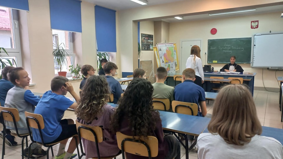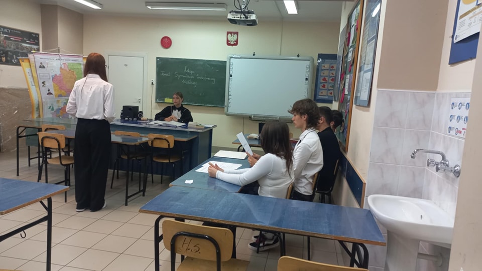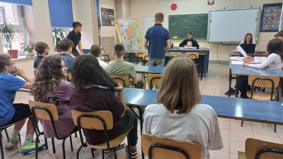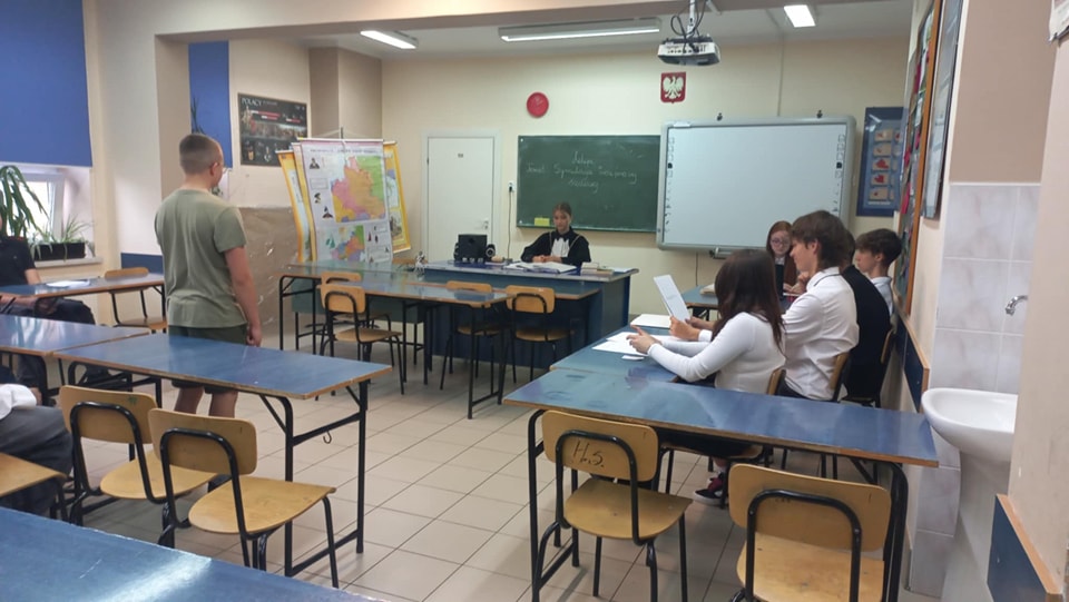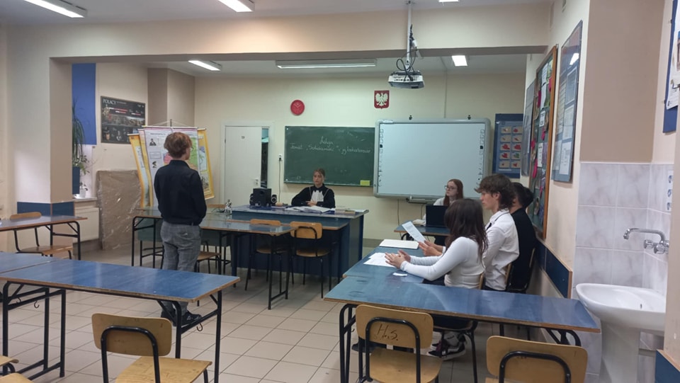 W ramach zajęć wiedzy o społeczeństwie uczniowie klas ósmych pod kierunkiem nauczyciela przygotowali symulację rozprawy sądowej . Symulacja procesu jest świetnym pomysłem na połączenie nauki z ciekawym, realnym doświadczeniem (czasem nawet zabawą). Uczniowie kl. 8a i 8b wymyślili samodzielnie temat rozprawy, opracowali scenariusz, a następnie wcieli się w role poszczególnych uczestników. Na drzwiach klasy zawisła wokanda, a następnie uczniowie z dużym zaangażowaniem przeprowadzili postępowanie sądowe. Symulacja procesu pomaga zrozumieć „prawo w działaniu”, pozwala na przeżycie i doświadczenie „prawdziwego” procesu sądowego. Gratulujemy uczniom podjęcia się tego wyzwania.