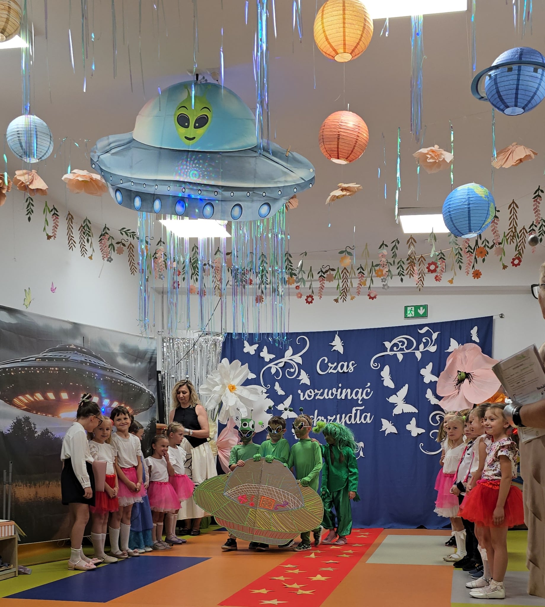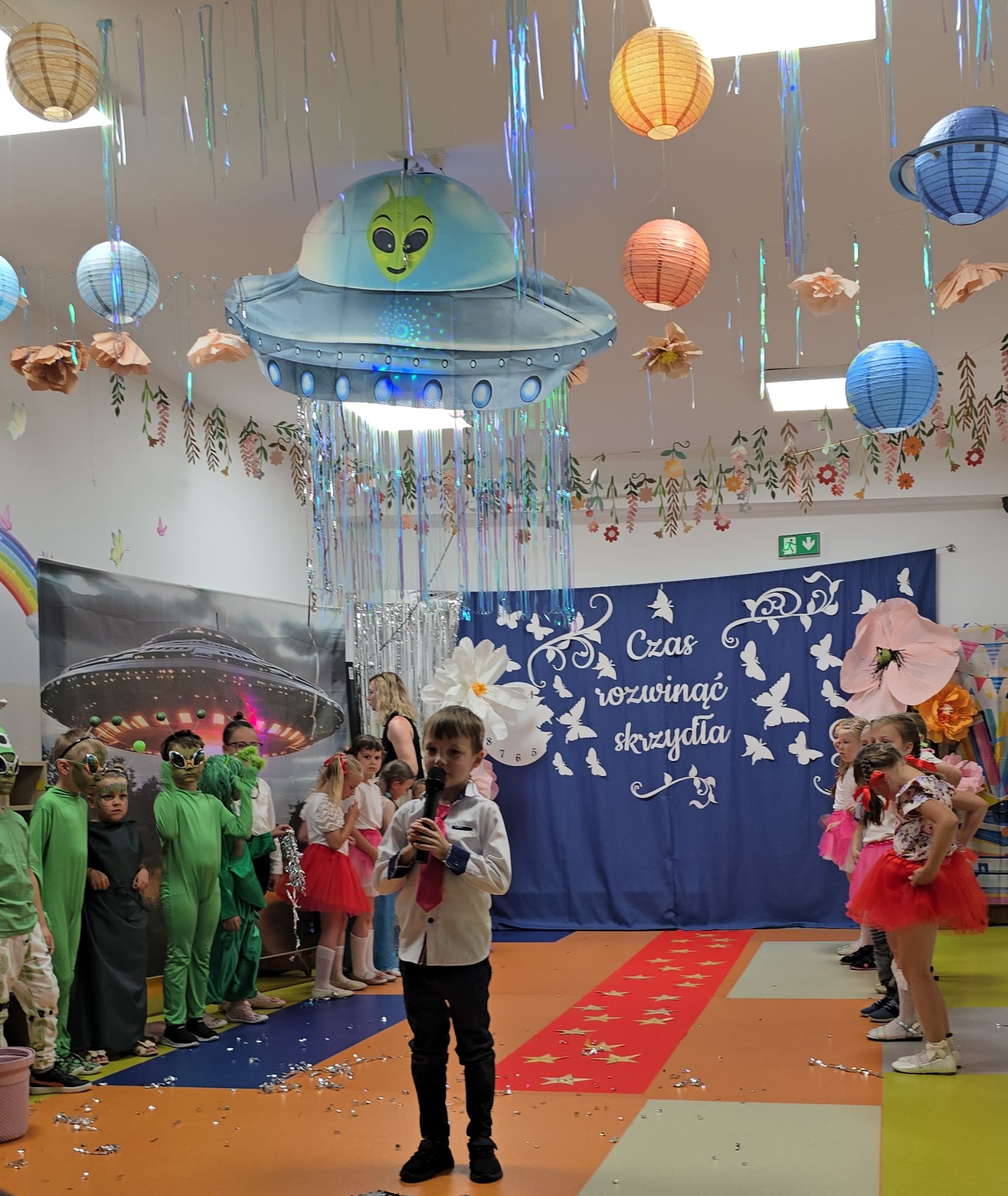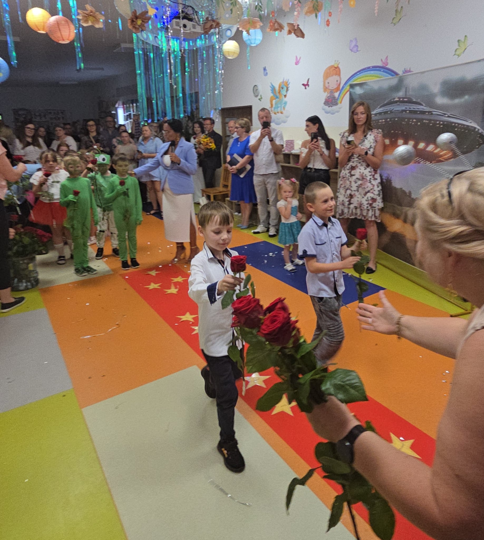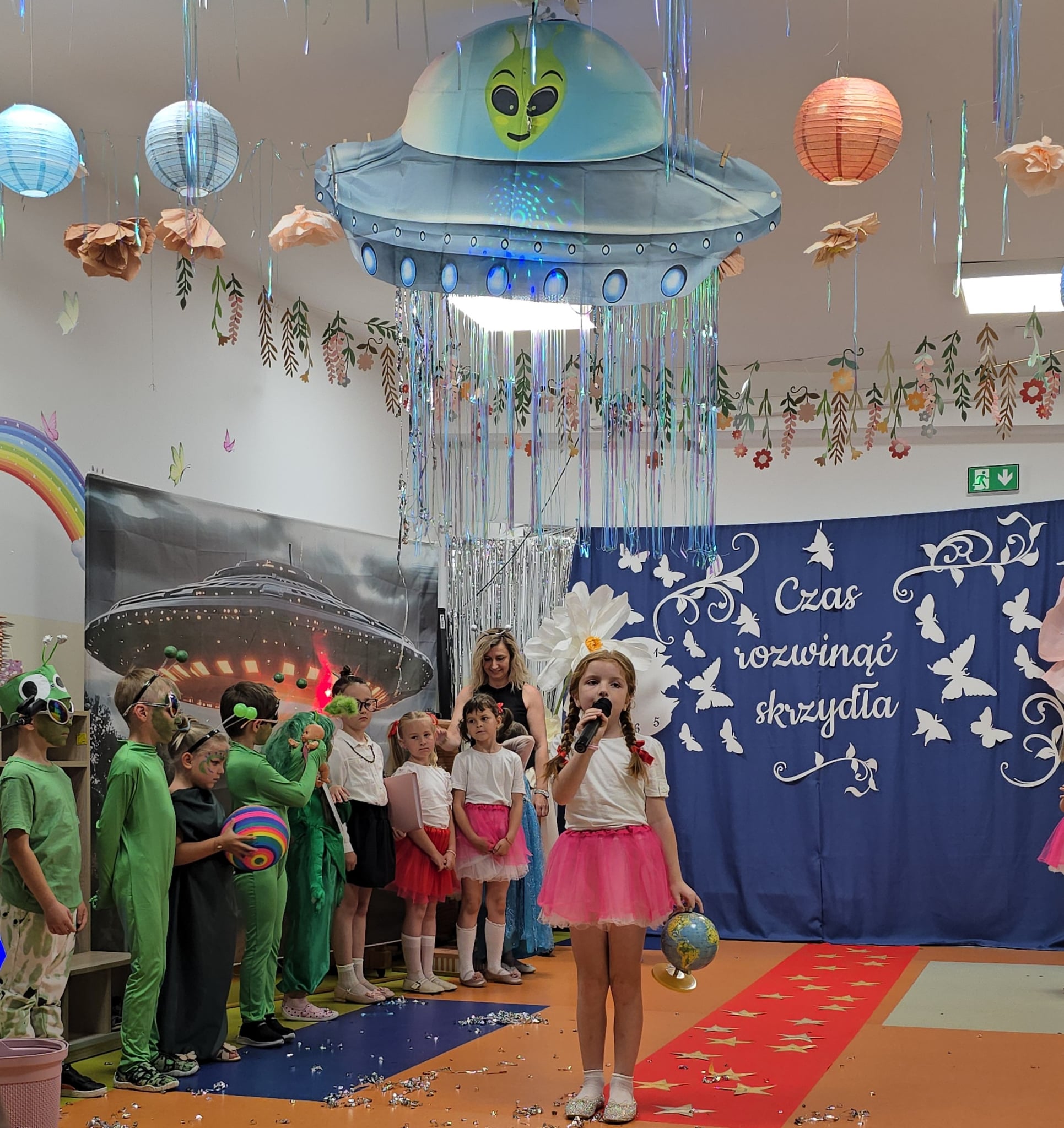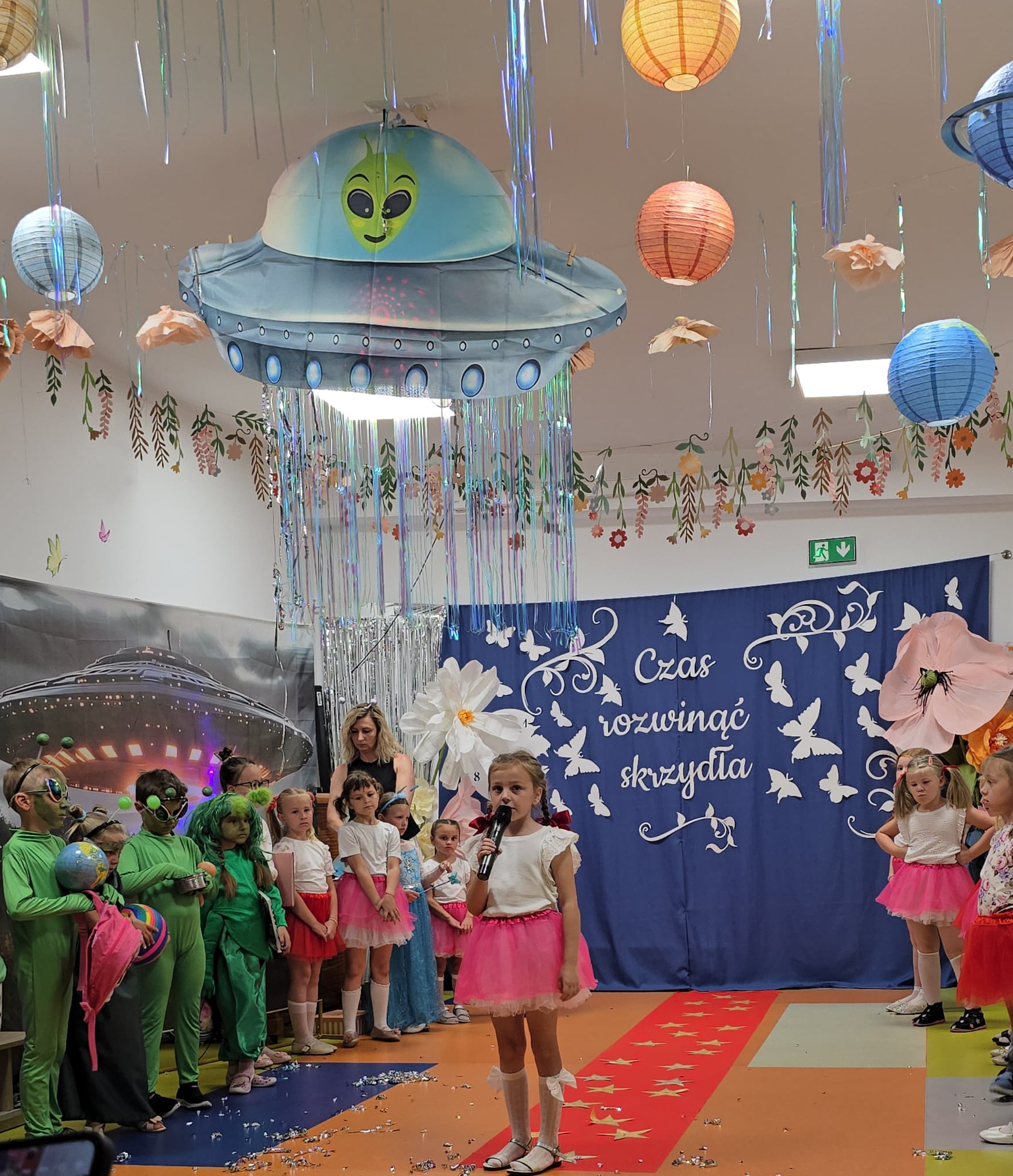 100 zdjęć nie odda tych chwil… bo to, co najpiękniejsze, zostaje w sercu. Kosmiczne Zakończenie Roku… i to dosłownie! Naszą uroczystość odwiedzili nawet kosmici, by pożegnać grupę niesamowitych 6-latków, którzy po czterech wspólnych latach wyruszają w nową podróż życia. Było wszystko, co najpiękniejsze: bajeczny tort, korowód kwiatów dla naszych wspaniałych Pań, cudowne karykatury – wyjątkowa pamiątka pełna uśmiechu i przede wszystkim Wy – dzieci, które świeciły na scenie jak najjaśniejsze gwiazdy. Wzruszenie mieszało się z dumą – goście byli oczarowani. Dziękujemy z całego serca Rodzicom i Dzieciom za ten wspólny czas, za każdy krok, który przeszliśmy razem. To nie pożegnanie – to piękne „do zobaczenia”… Wasza podróż dopiero się zaczyna!