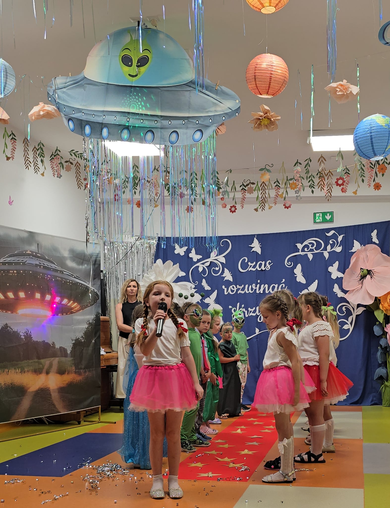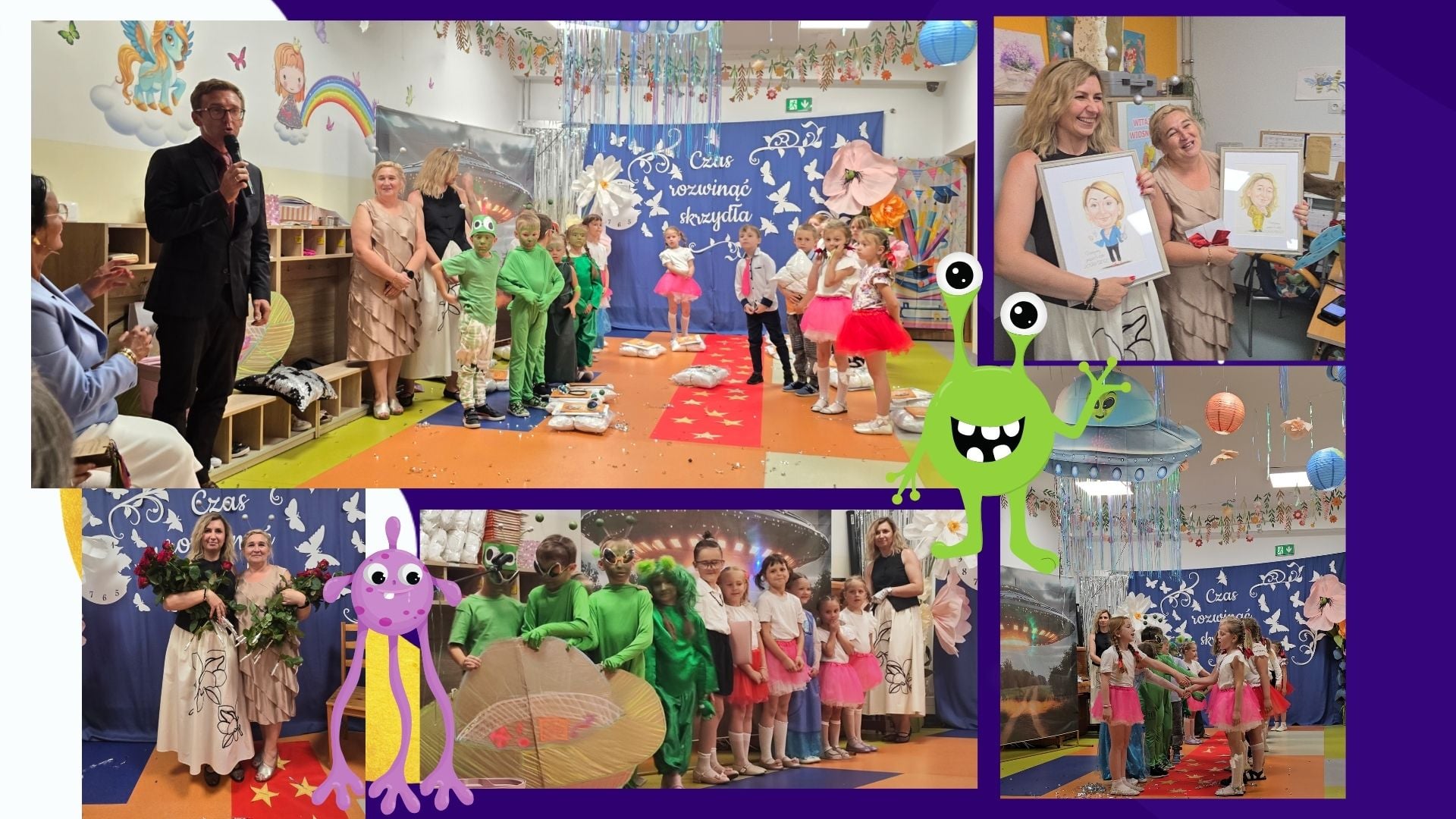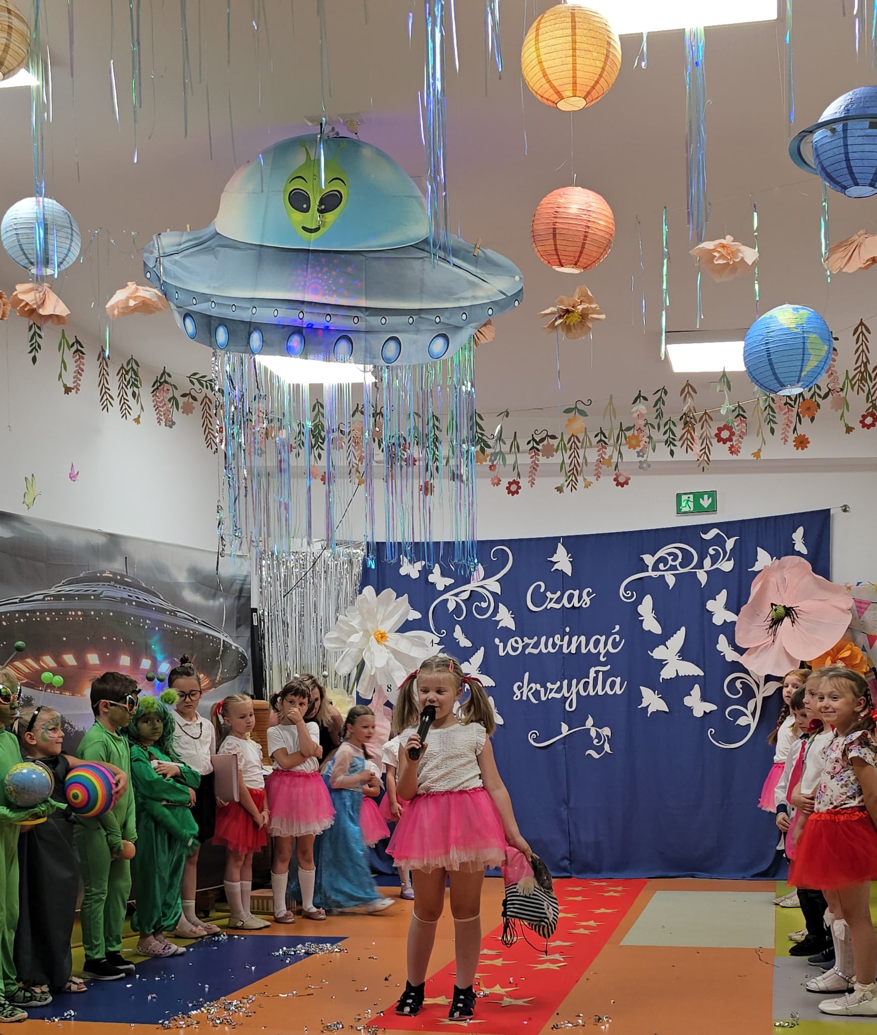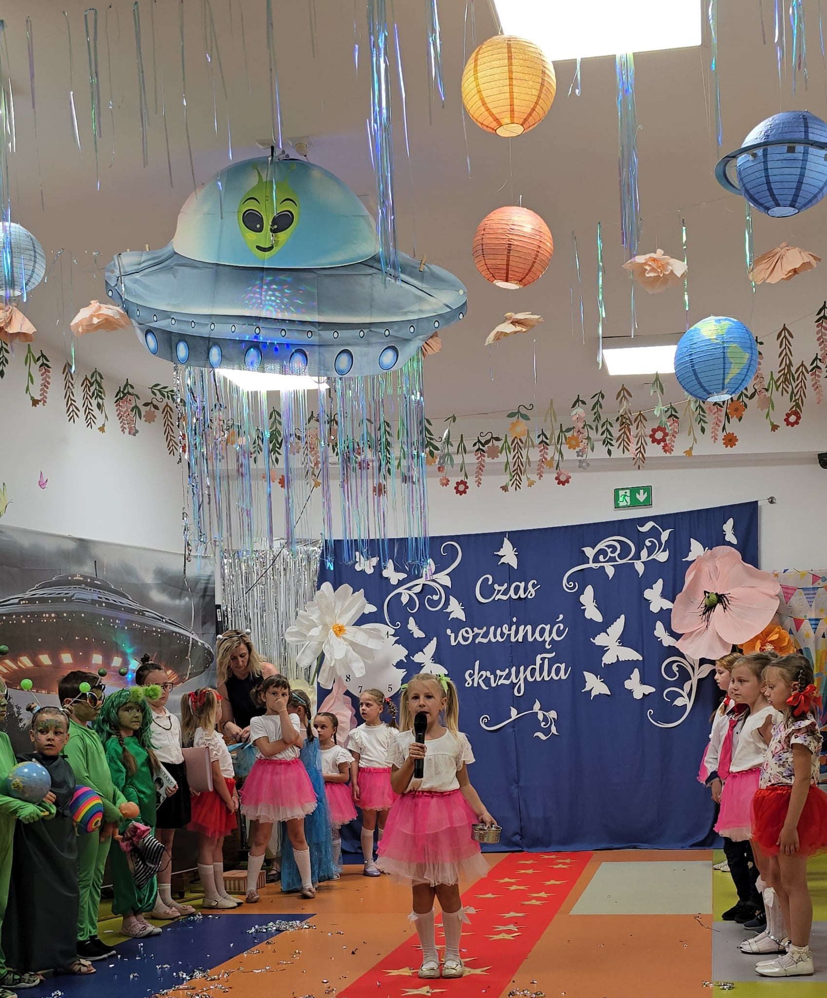 100 zdjęć nie odda tych chwil… bo to, co najpiękniejsze, zostaje w sercu. Kosmiczne Zakończenie Roku… i to dosłownie! Naszą uroczystość odwiedzili nawet kosmici, by pożegnać grupę niesamowitych 6-latków, którzy po czterech wspólnych latach wyruszają w nową podróż życia. Było wszystko, co najpiękniejsze: bajeczny tort, korowód kwiatów dla naszych wspaniałych Pań, cudowne karykatury – wyjątkowa pamiątka pełna uśmiechu i przede wszystkim Wy – dzieci, które świeciły na scenie jak najjaśniejsze gwiazdy. Wzruszenie mieszało się z dumą – goście byli oczarowani. Dziękujemy z całego serca Rodzicom i Dzieciom za ten wspólny czas, za każdy krok, który przeszliśmy razem. To nie pożegnanie – to piękne „do zobaczenia”… Wasza podróż dopiero się zaczyna!