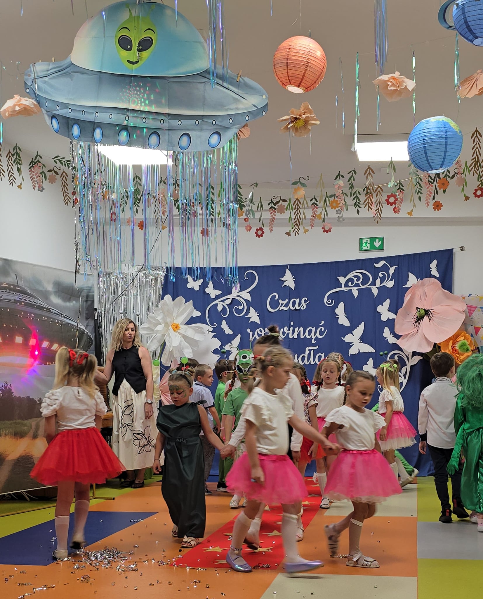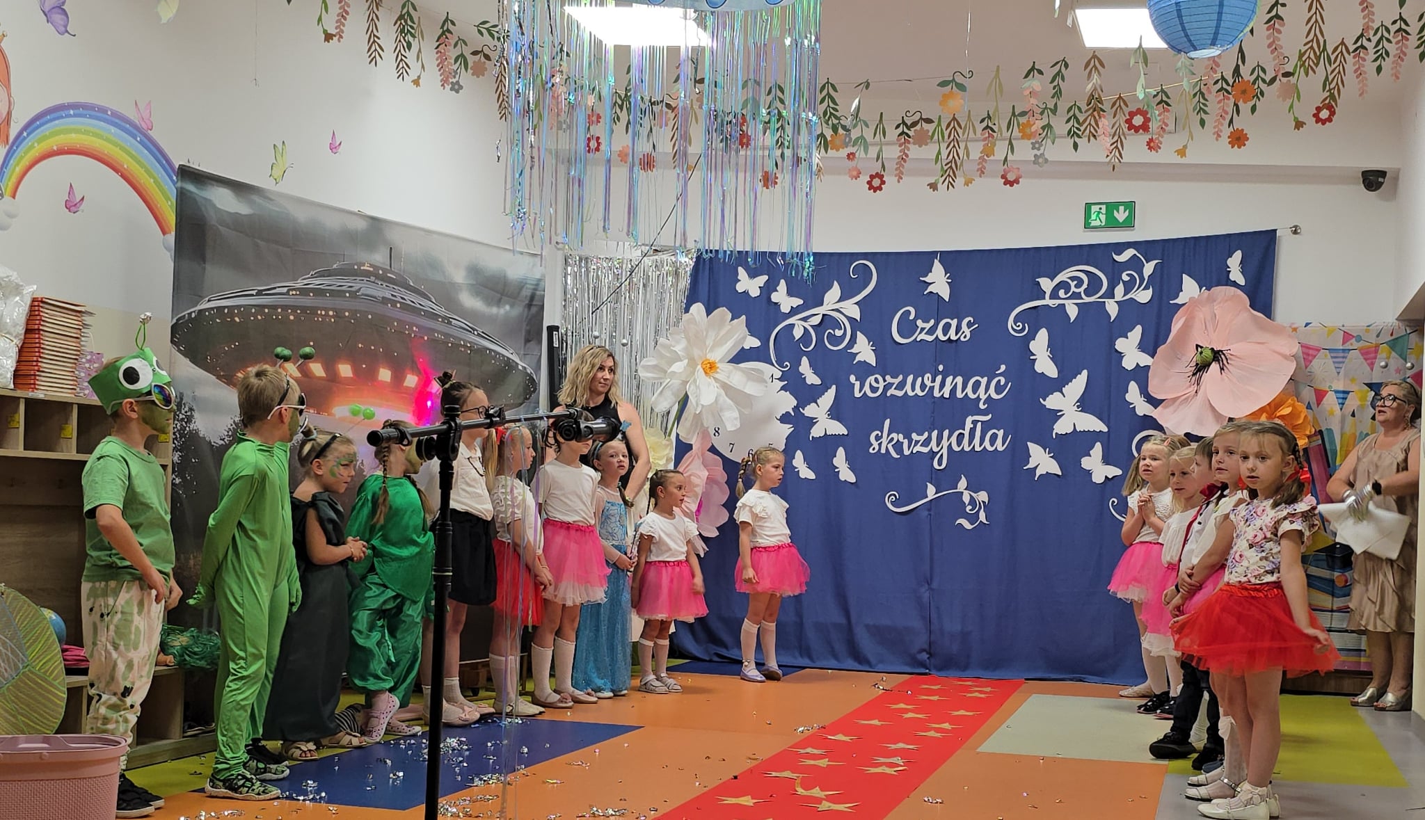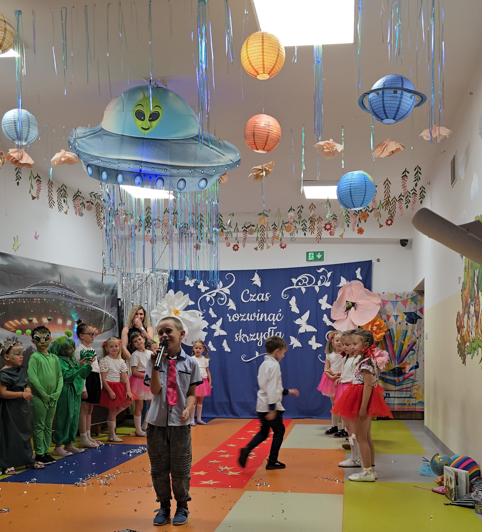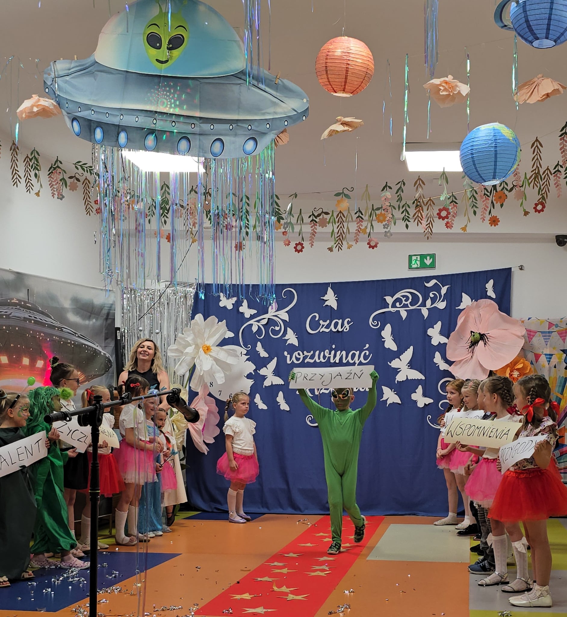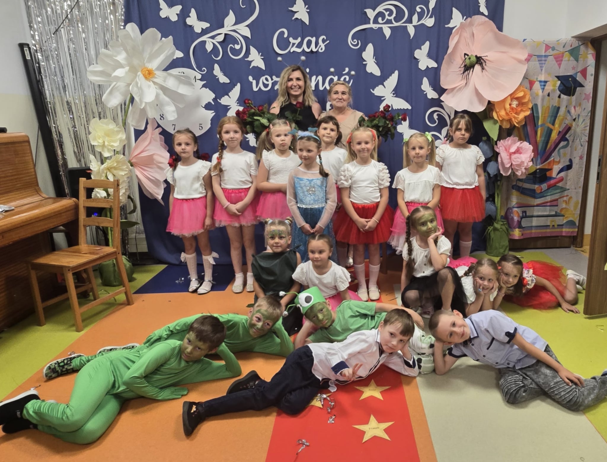 100 zdjęć nie odda tych chwil… bo to, co najpiękniejsze, zostaje w sercu. Kosmiczne Zakończenie Roku… i to dosłownie! Naszą uroczystość odwiedzili nawet kosmici, by pożegnać grupę niesamowitych 6-latków, którzy po czterech wspólnych latach wyruszają w nową podróż życia. Było wszystko, co najpiękniejsze: bajeczny tort, korowód kwiatów dla naszych wspaniałych Pań, cudowne karykatury – wyjątkowa pamiątka pełna uśmiechu i przede wszystkim Wy – dzieci, które świeciły na scenie jak najjaśniejsze gwiazdy. Wzruszenie mieszało się z dumą – goście byli oczarowani. Dziękujemy z całego serca Rodzicom i Dzieciom za ten wspólny czas, za każdy krok, który przeszliśmy razem. To nie pożegnanie – to piękne „do zobaczenia”… Wasza podróż dopiero się zaczyna!