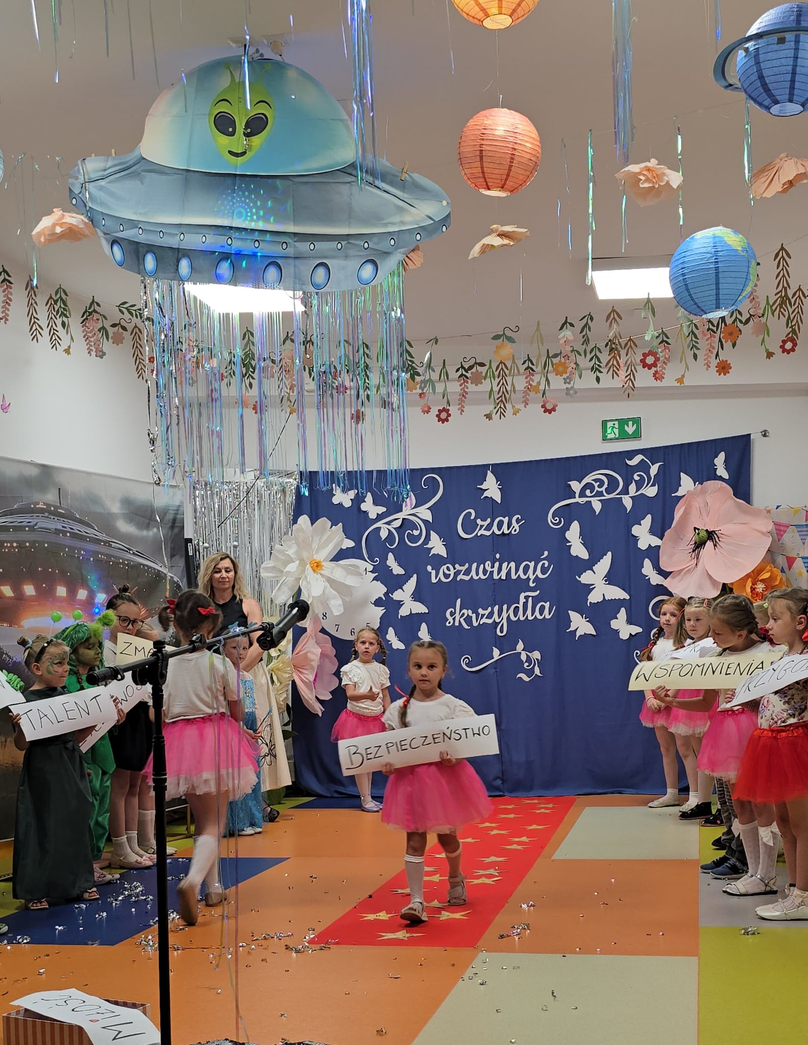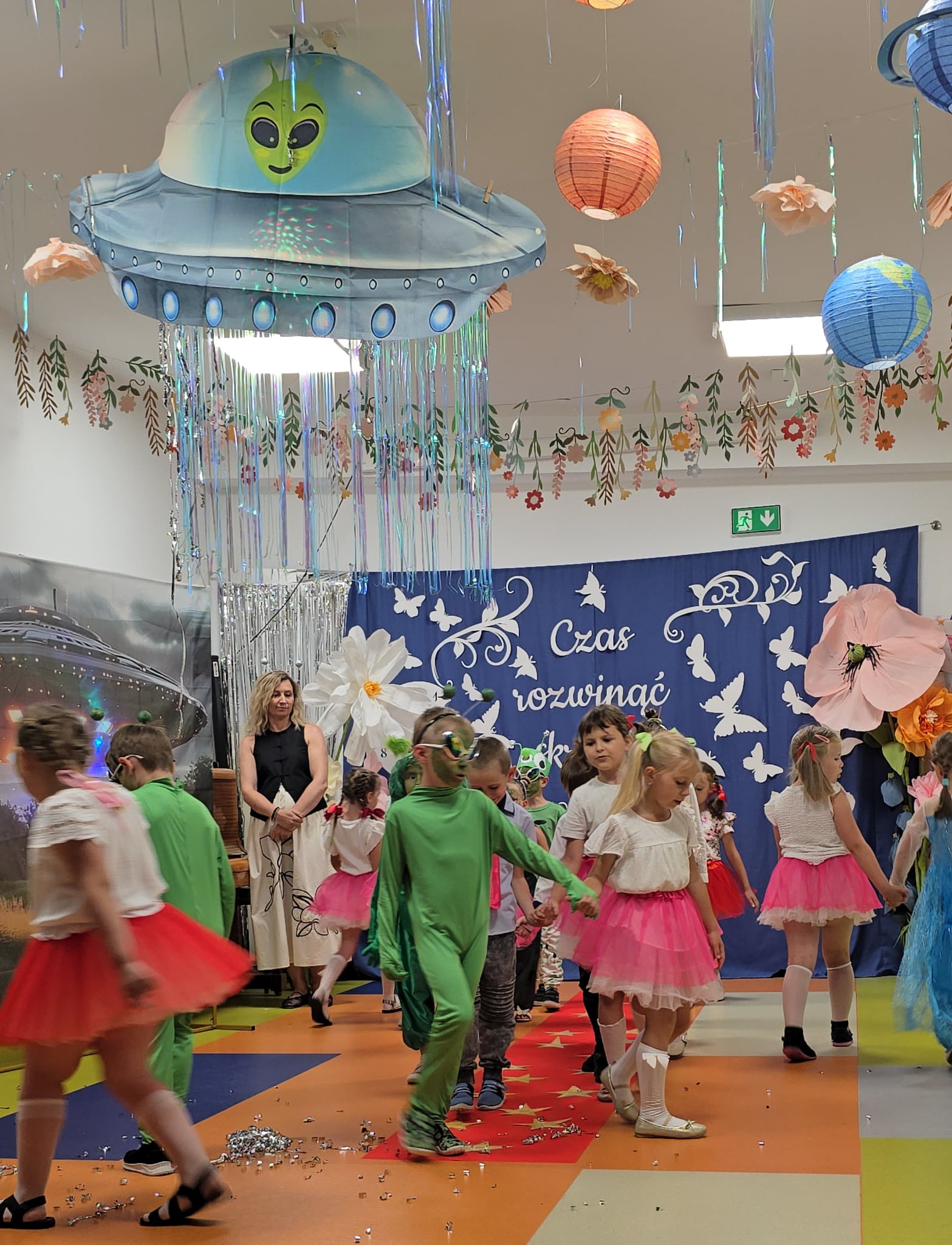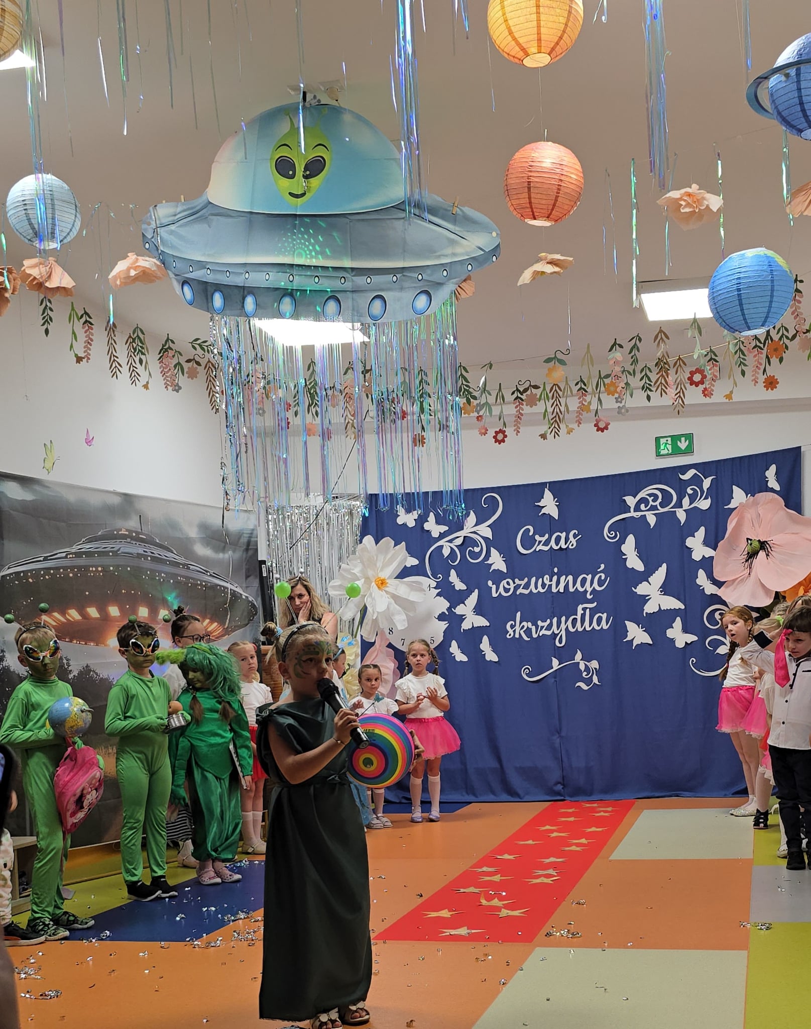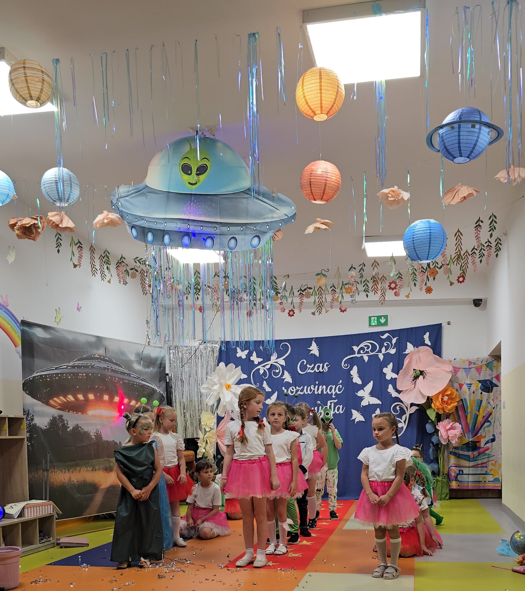 100 zdjęć nie odda tych chwil… bo to, co najpiękniejsze, zostaje w sercu. Kosmiczne Zakończenie Roku… i to dosłownie! Naszą uroczystość odwiedzili nawet kosmici, by pożegnać grupę niesamowitych 6-latków, którzy po czterech wspólnych latach wyruszają w nową podróż życia. Było wszystko, co najpiękniejsze: bajeczny tort, korowód kwiatów dla naszych wspaniałych Pań, cudowne karykatury – wyjątkowa pamiątka pełna uśmiechu i przede wszystkim Wy – dzieci, które świeciły na scenie jak najjaśniejsze gwiazdy. Wzruszenie mieszało się z dumą – goście byli oczarowani. Dziękujemy z całego serca Rodzicom i Dzieciom za ten wspólny czas, za każdy krok, który przeszliśmy razem. To nie pożegnanie – to piękne „do zobaczenia”… Wasza podróż dopiero się zaczyna!