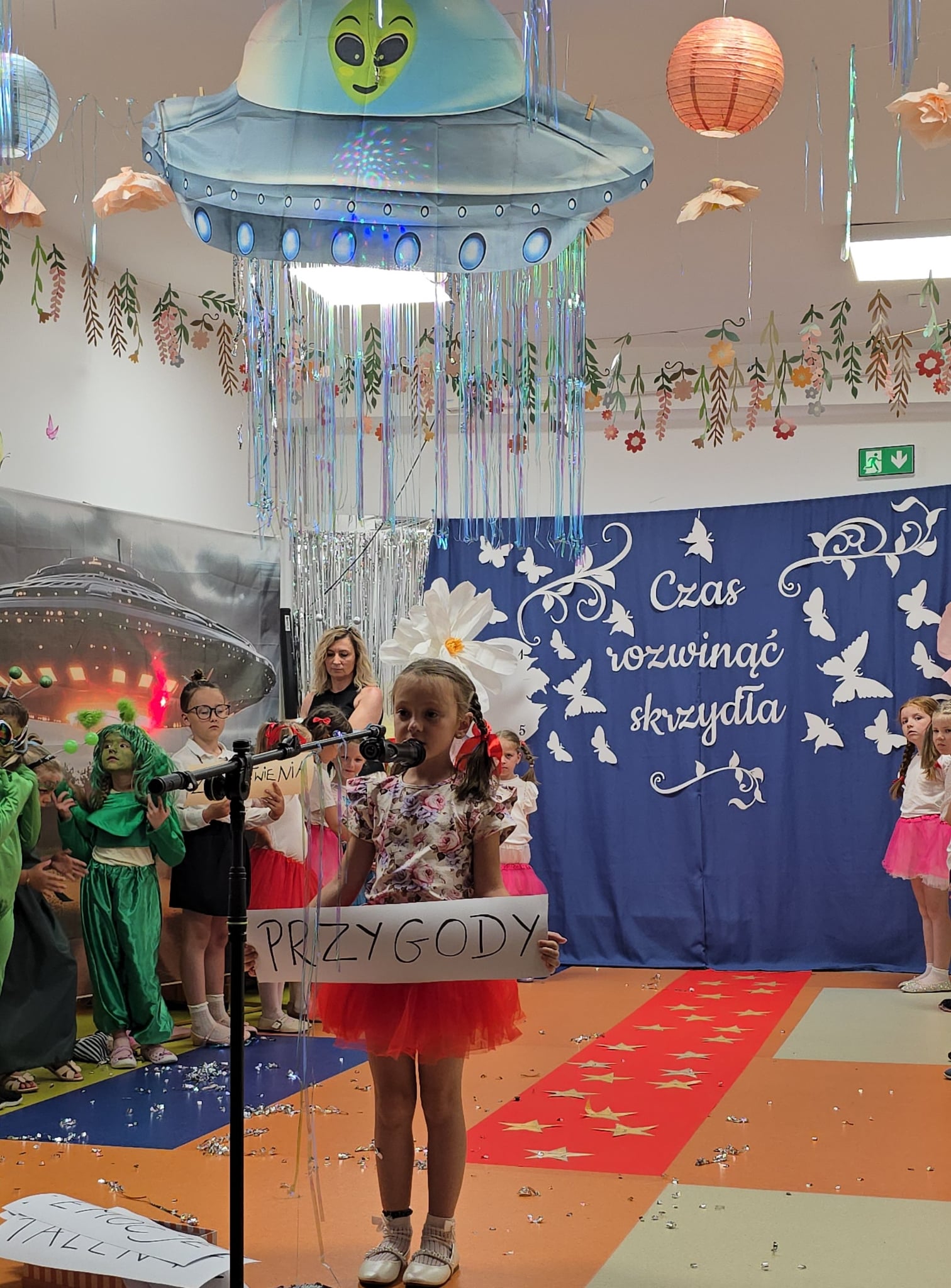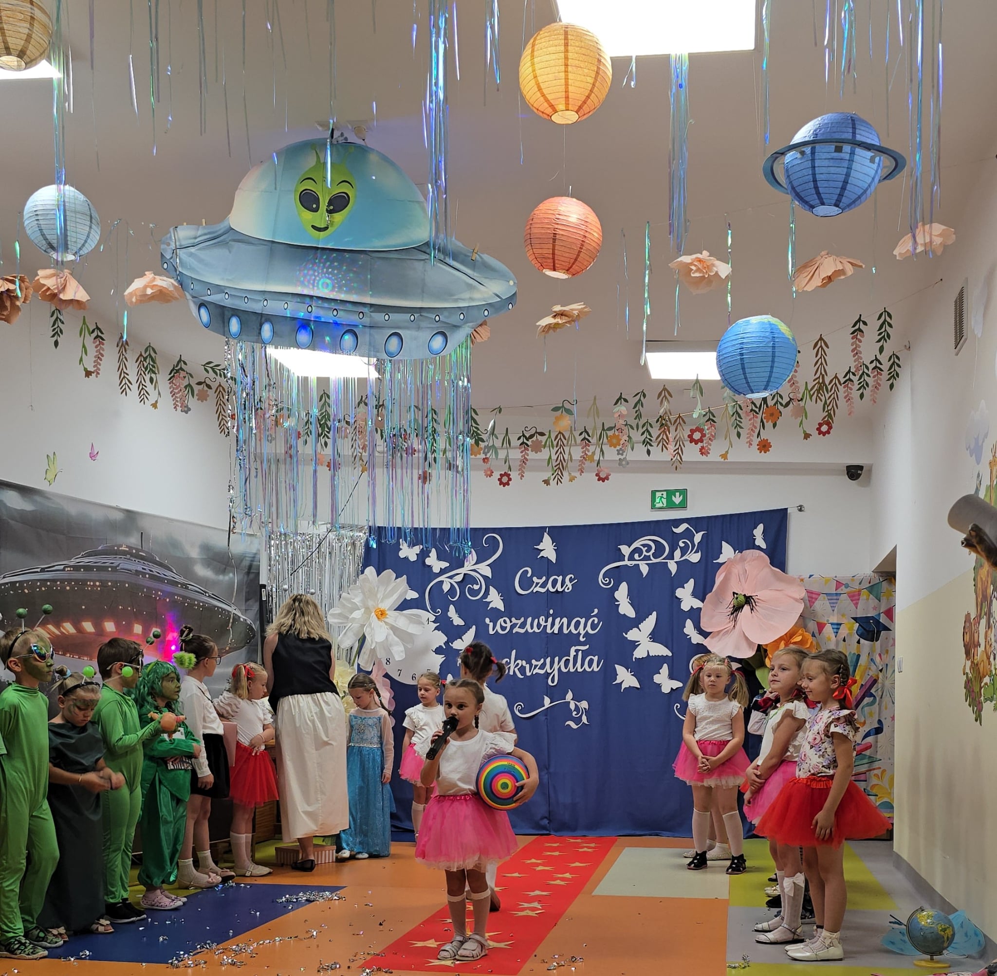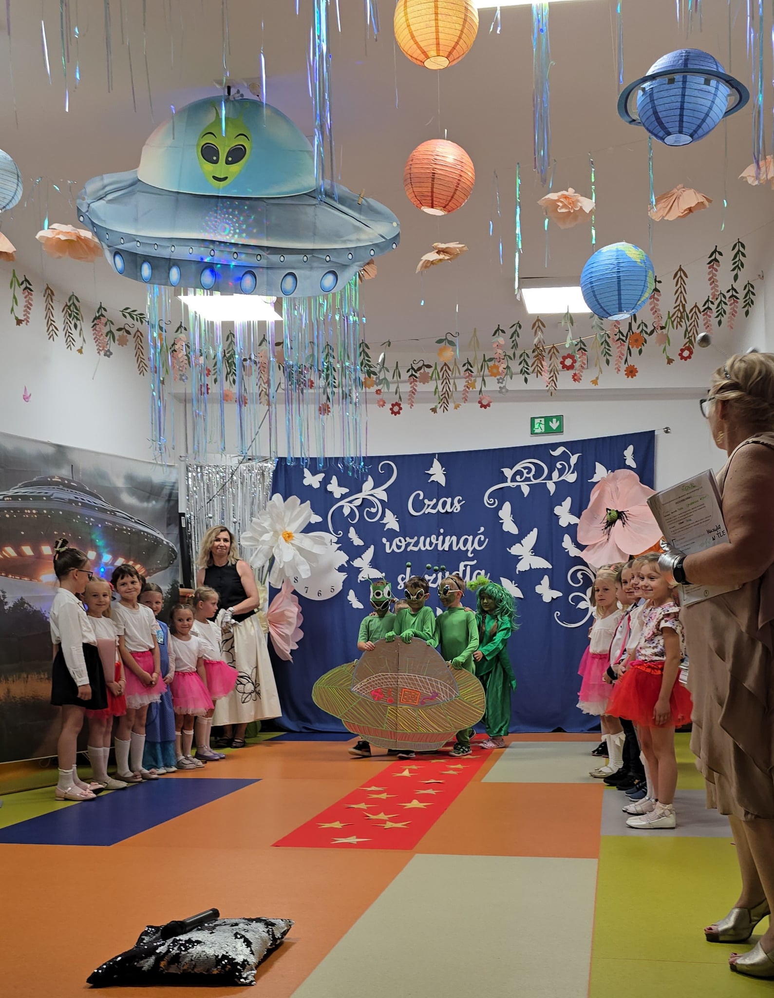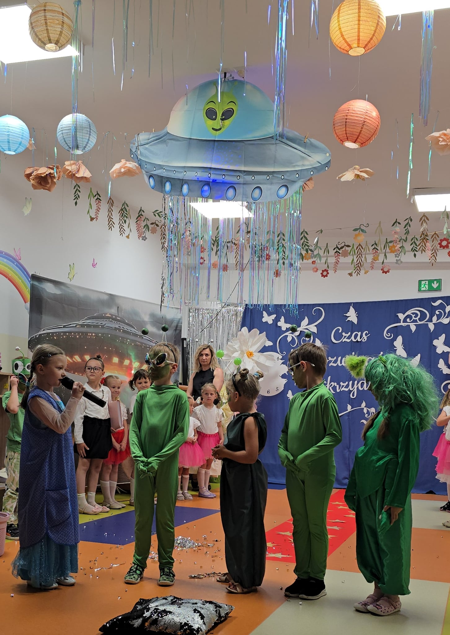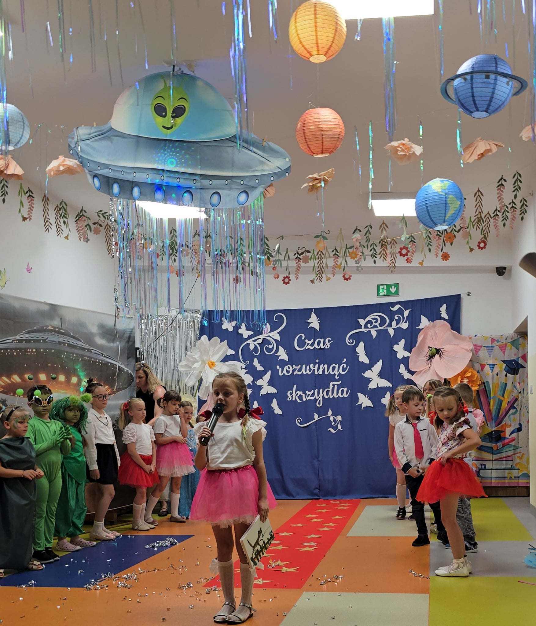 100 zdjęć nie odda tych chwil… bo to, co najpiękniejsze, zostaje w sercu. Kosmiczne Zakończenie Roku… i to dosłownie! Naszą uroczystość odwiedzili nawet kosmici, by pożegnać grupę niesamowitych 6-latków, którzy po czterech wspólnych latach wyruszają w nową podróż życia. Było wszystko, co najpiękniejsze: bajeczny tort, korowód kwiatów dla naszych wspaniałych Pań, cudowne karykatury – wyjątkowa pamiątka pełna uśmiechu i przede wszystkim Wy – dzieci, które świeciły na scenie jak najjaśniejsze gwiazdy. Wzruszenie mieszało się z dumą – goście byli oczarowani. Dziękujemy z całego serca Rodzicom i Dzieciom za ten wspólny czas, za każdy krok, który przeszliśmy razem. To nie pożegnanie – to piękne „do zobaczenia”… Wasza podróż dopiero się zaczyna!