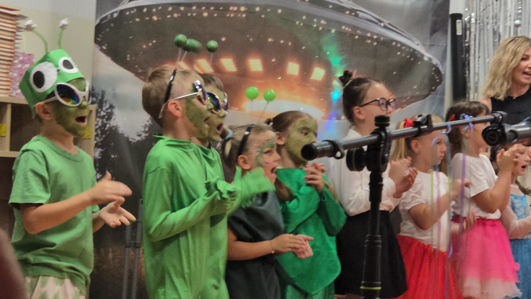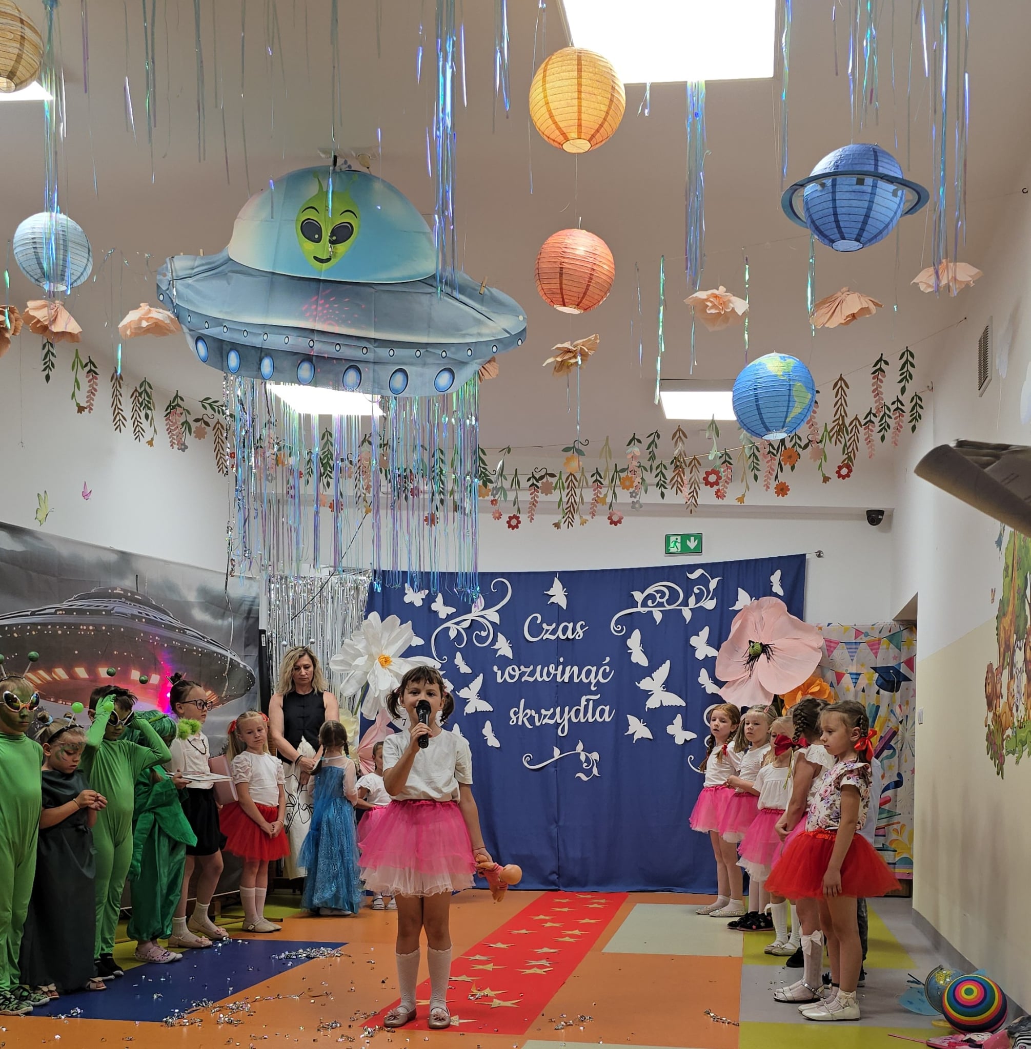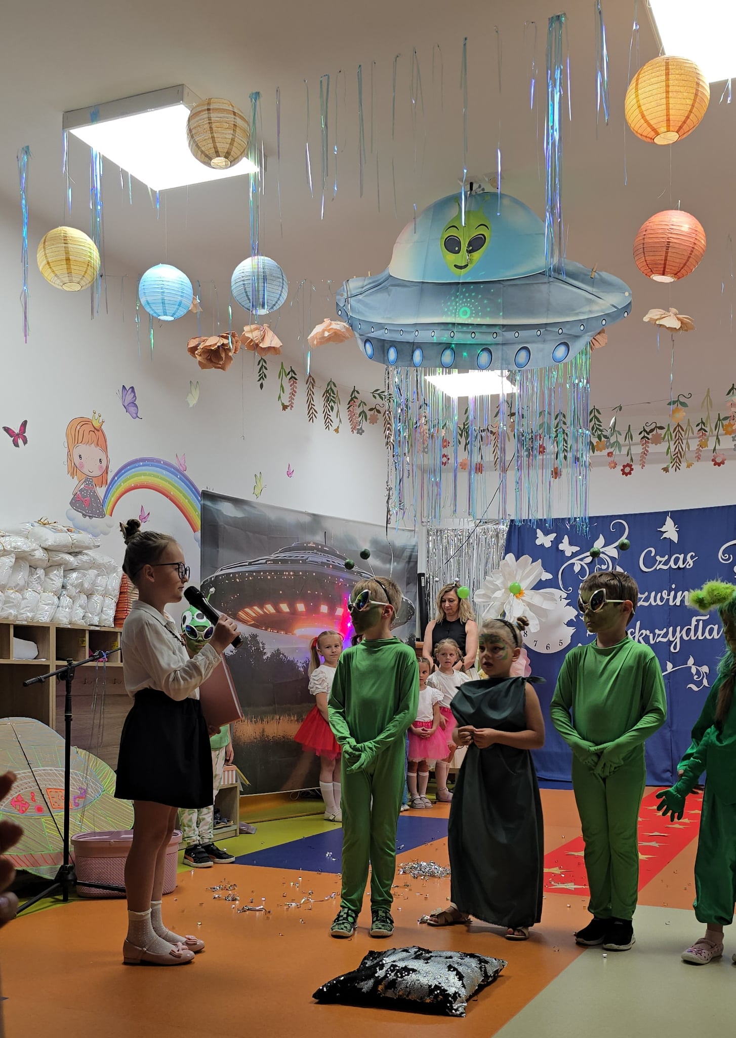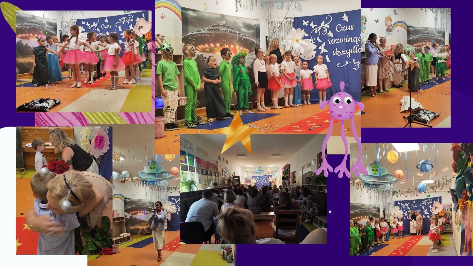 100 zdjęć nie odda tych chwil… bo to, co najpiękniejsze, zostaje w sercu. Kosmiczne Zakończenie Roku… i to dosłownie! Naszą uroczystość odwiedzili nawet kosmici, by pożegnać grupę niesamowitych 6-latków, którzy po czterech wspólnych latach wyruszają w nową podróż życia. Było wszystko, co najpiękniejsze: bajeczny tort, korowód kwiatów dla naszych wspaniałych Pań, cudowne karykatury – wyjątkowa pamiątka pełna uśmiechu i przede wszystkim Wy – dzieci, które świeciły na scenie jak najjaśniejsze gwiazdy. Wzruszenie mieszało się z dumą – goście byli oczarowani. Dziękujemy z całego serca Rodzicom i Dzieciom za ten wspólny czas, za każdy krok, który przeszliśmy razem. To nie pożegnanie – to piękne „do zobaczenia”… Wasza podróż dopiero się zaczyna!