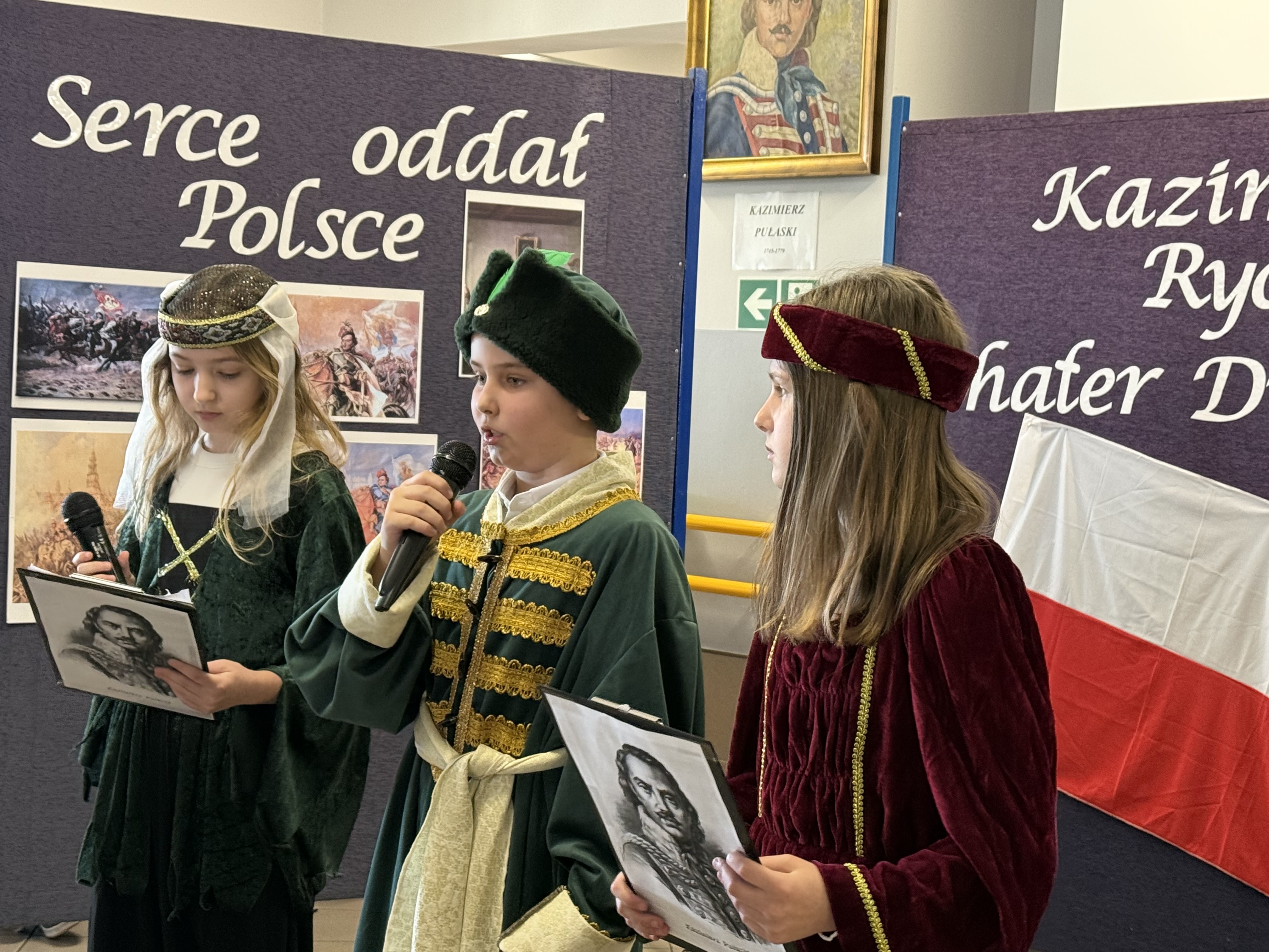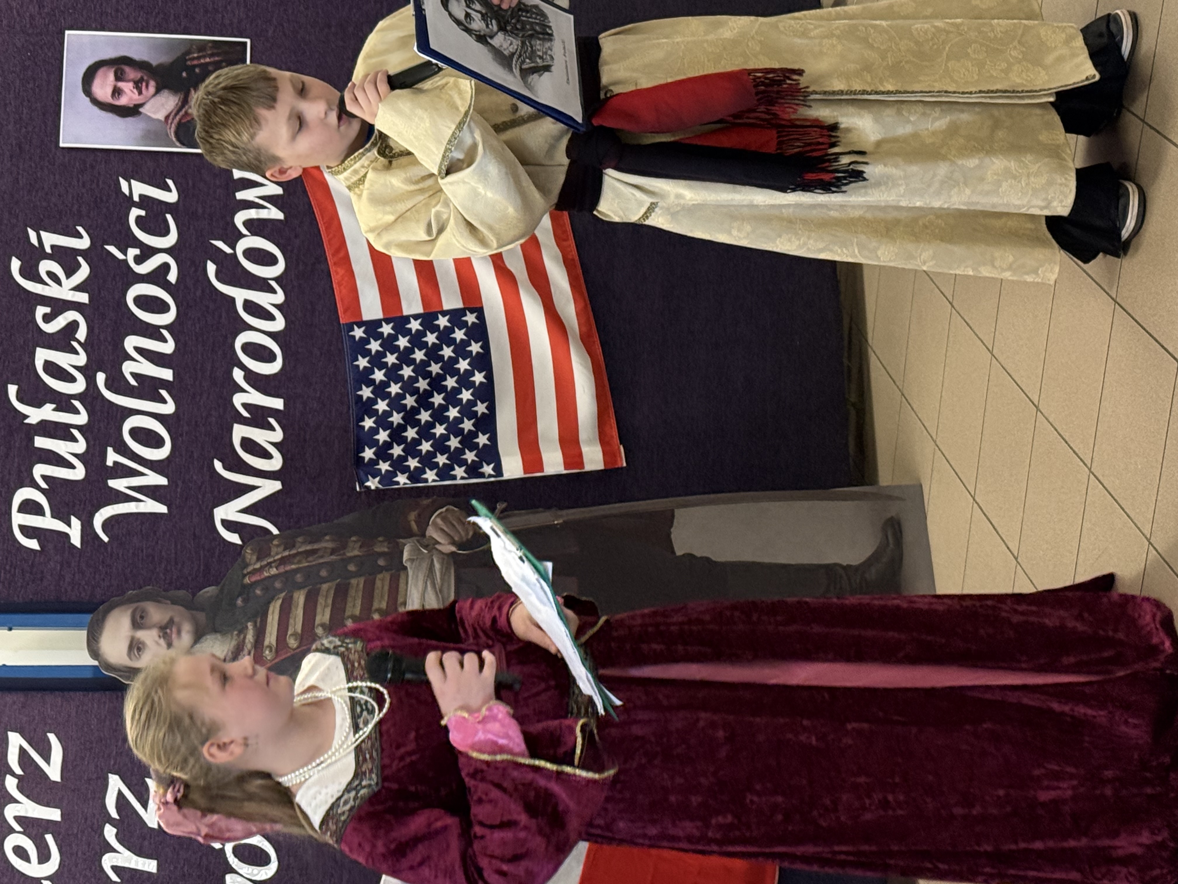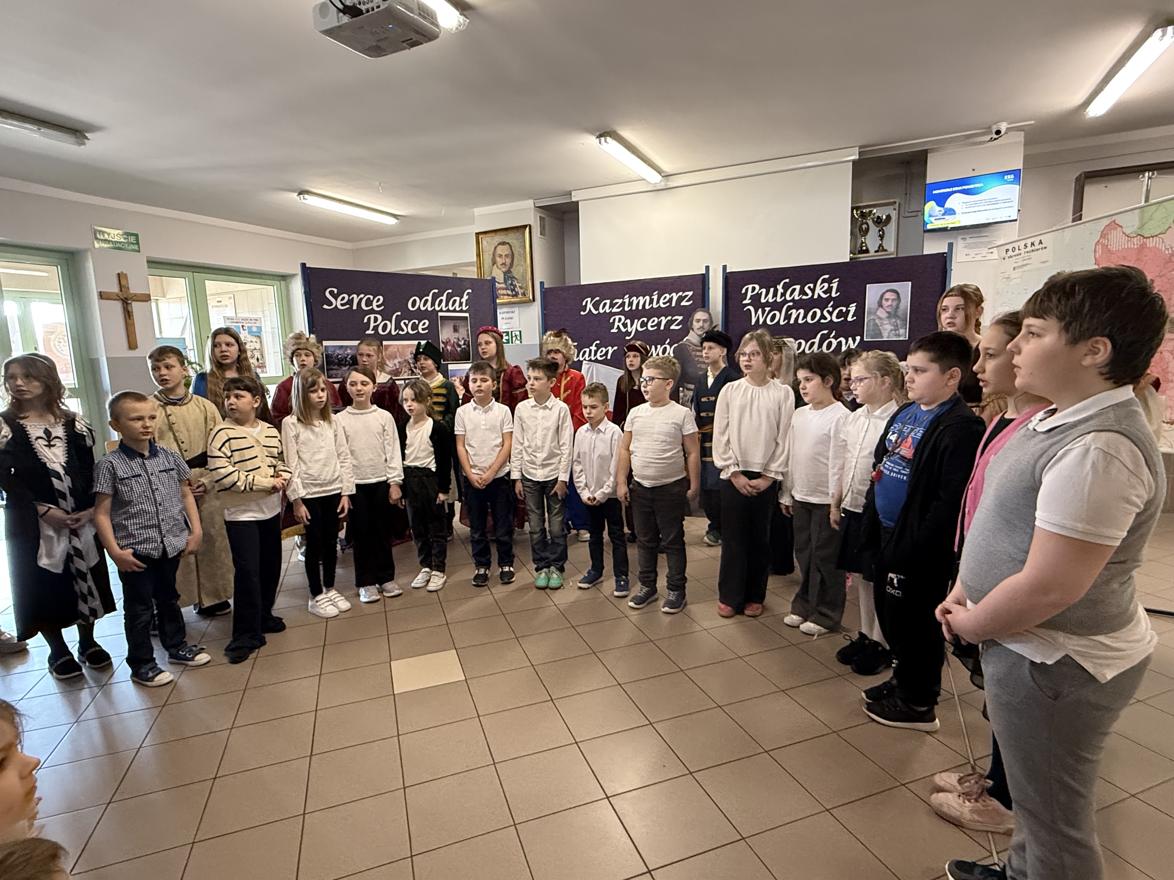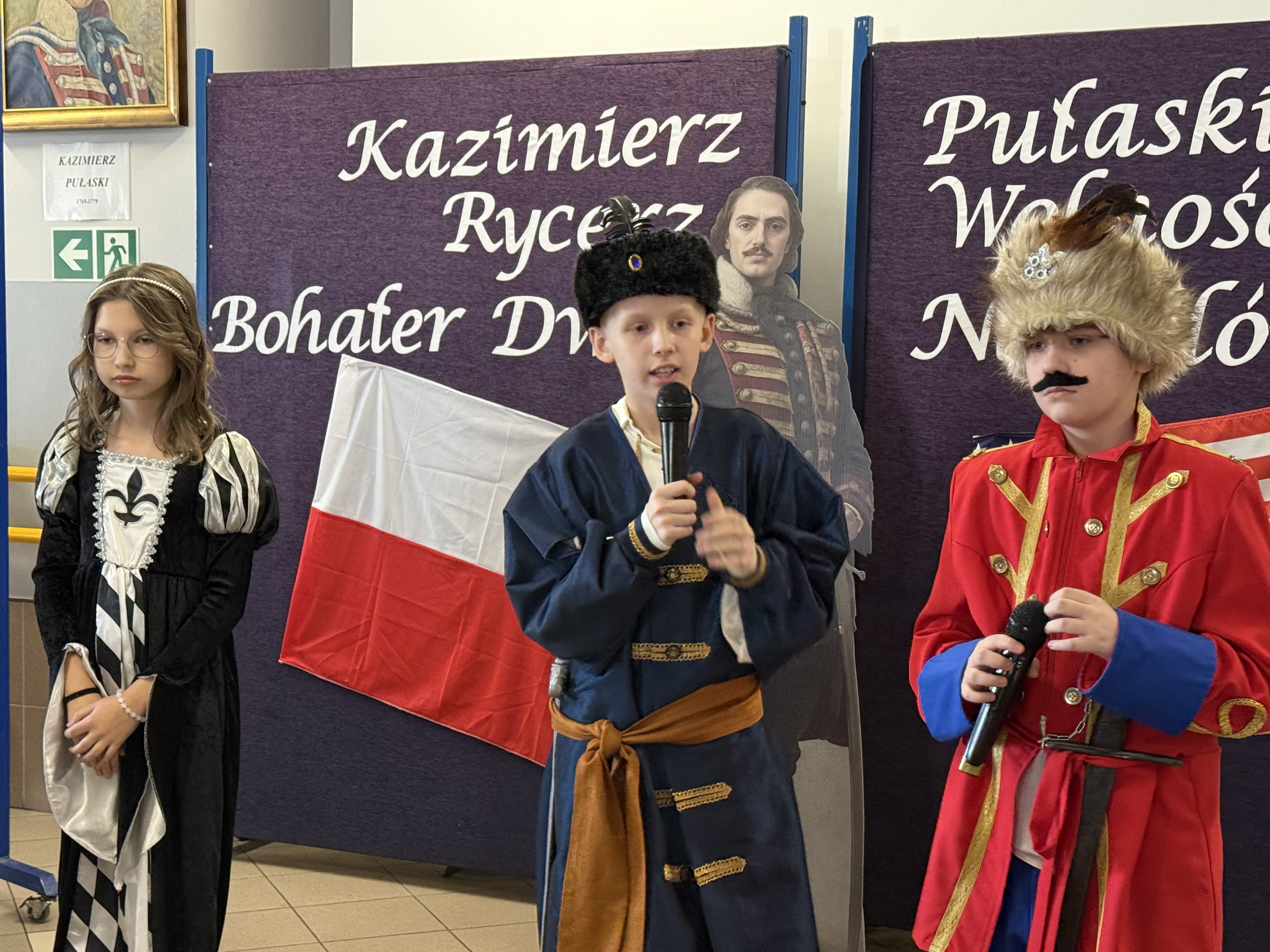 Dziś, w dniu urodzin i imienin naszego patrona – Kazimierza Pułaskiego, odbyła się uroczystość ku Jego czci – Dzień Patrona. Wydarzenie zostało przygotowane przez uczniów klasy V pod kierunkiem wychowawcy. Uroczystość rozpoczęła się od symbolicznego gestu pamięci. Pani Dyrektor wraz z dwojgiem uczniów najmłodszych klas zapaliła znicz pod popiersiem patrona, oddając hołd bohaterowi narodowemu i podkreślając znaczenie jego odwagi oraz poświęcenia dla ojczyzny. Następnie zgromadzeni mieli okazję wysłuchać niezwykłego przemówienia samego Kazimierza Pułaskiego. Dzięki zastosowaniu nowoczesnej technologii AI postać patrona „przemówiła” do uczniów, przybliżając swoją historię oraz wartości, którymi kierował się w życiu – patriotyzm, honor i odwagę. Kolejnym punktem programu był montaż słowno-muzyczny. Młodzi artyści zaprezentowali wiersze i pieśni o tematyce patriotycznej, wprowadzając wszystkich w podniosły i refleksyjny nastrój. Całość dopełniła ciekawa scenografia oraz wspaniałe stroje z epoki, które pozwoliły przenieść się w czasy, w których żył nasz patron. Uroczystość była nie tylko lekcją historii, ale także ważnym przypomnieniem o wartościach, które powinny towarzyszyć nam na co dzień. Dzięki zaangażowaniu uczniów Dzień Patrona stał się pięknym i inspirującym wydarzeniem w życiu naszej szkoły.