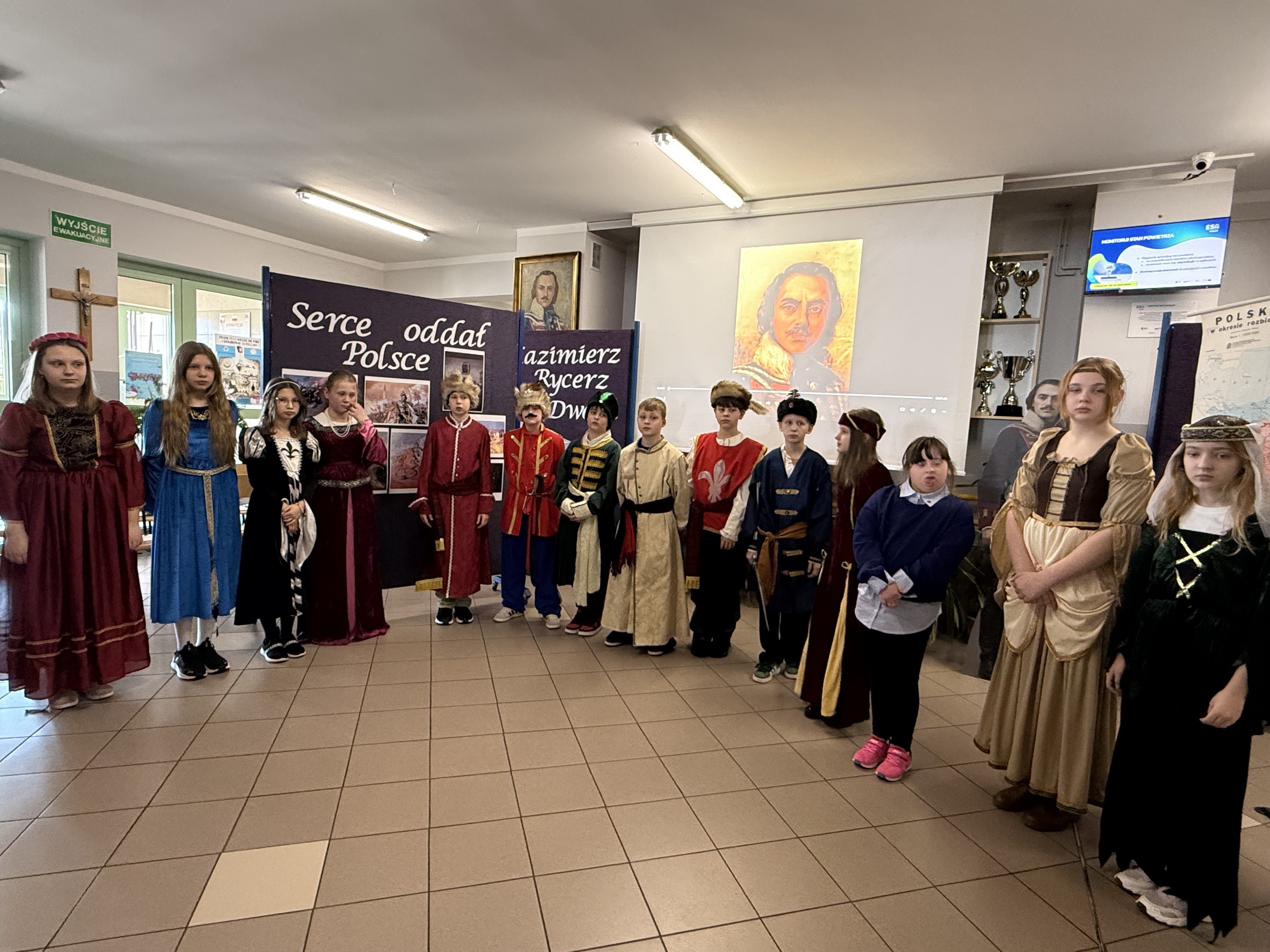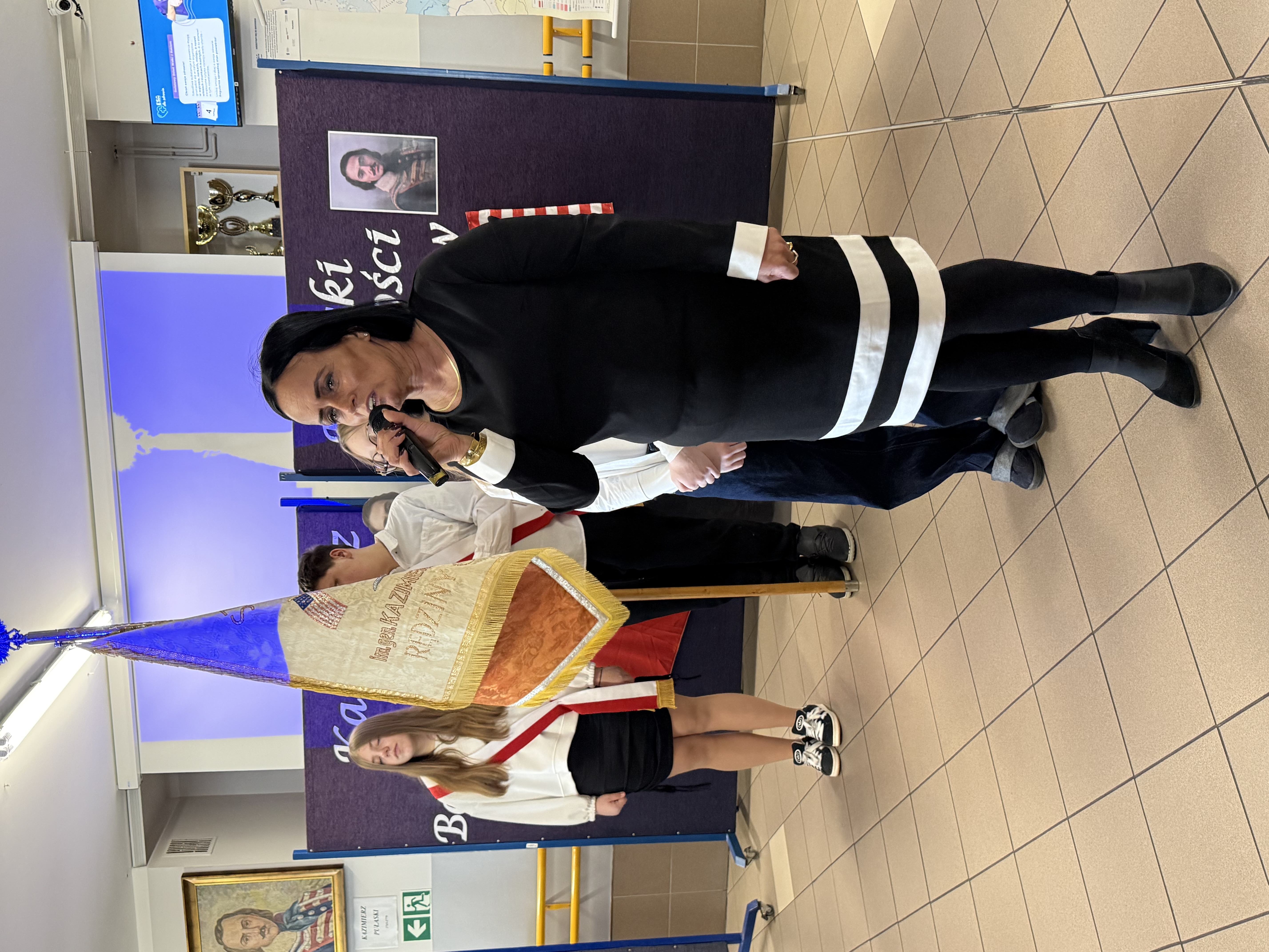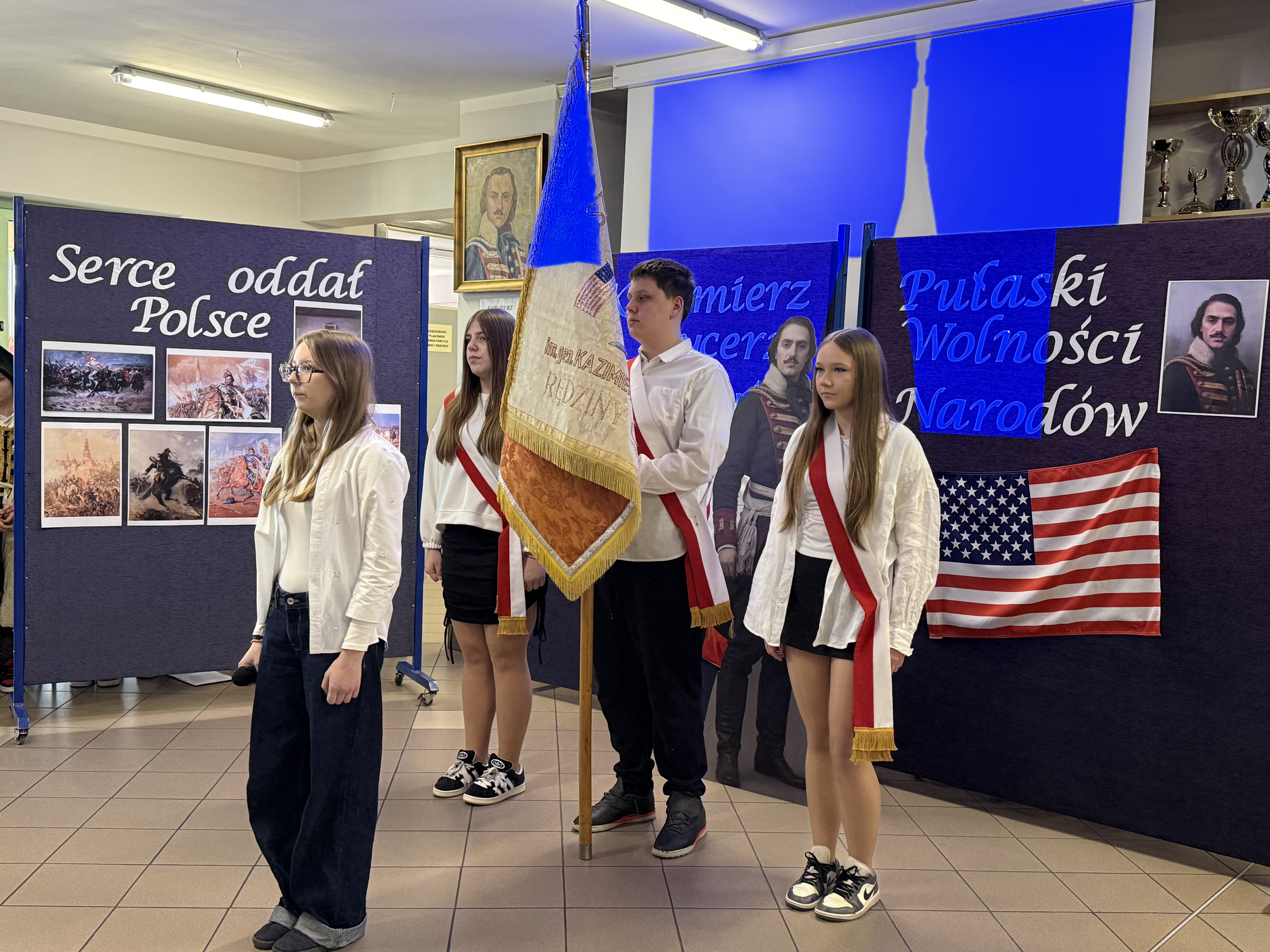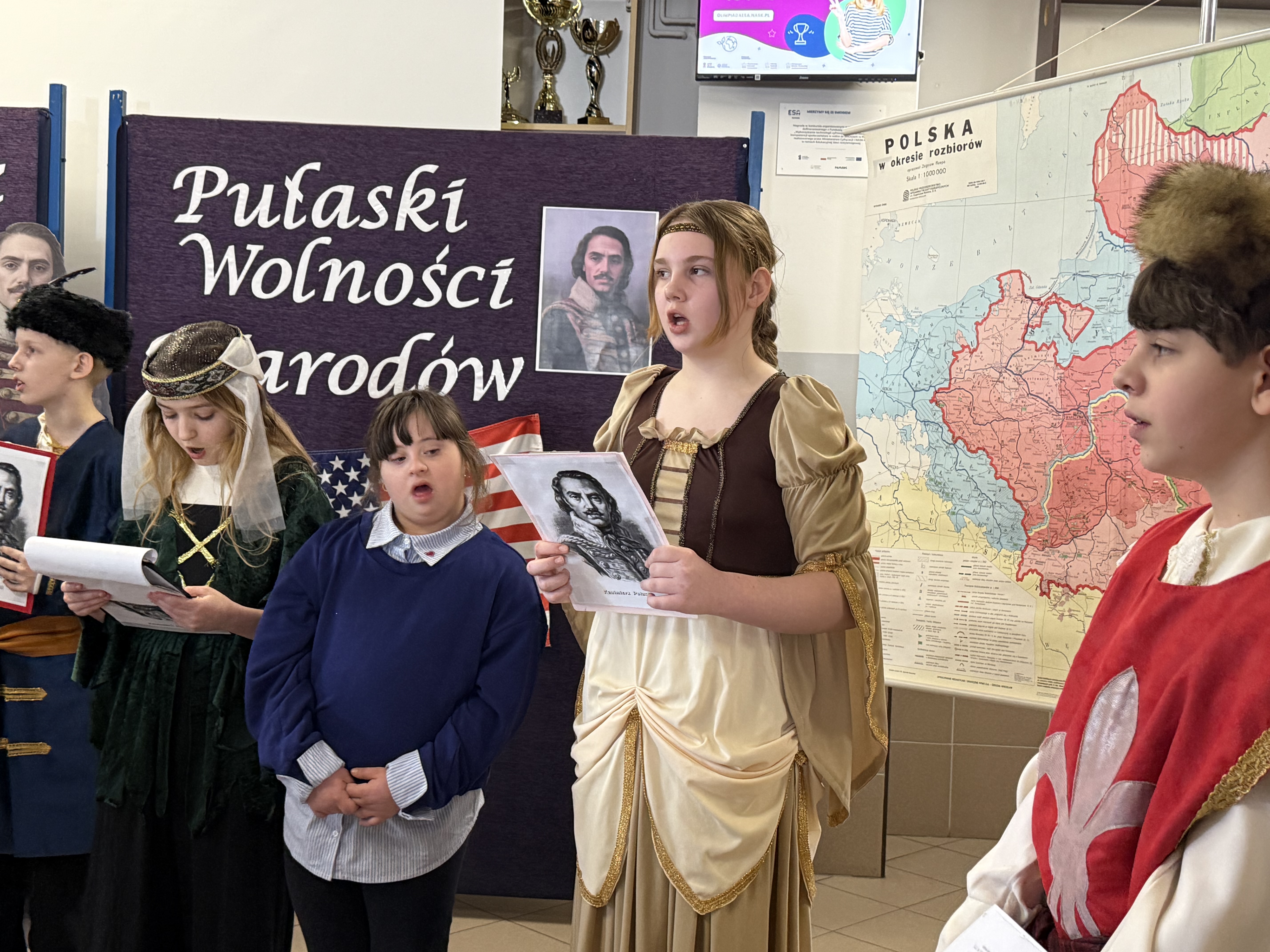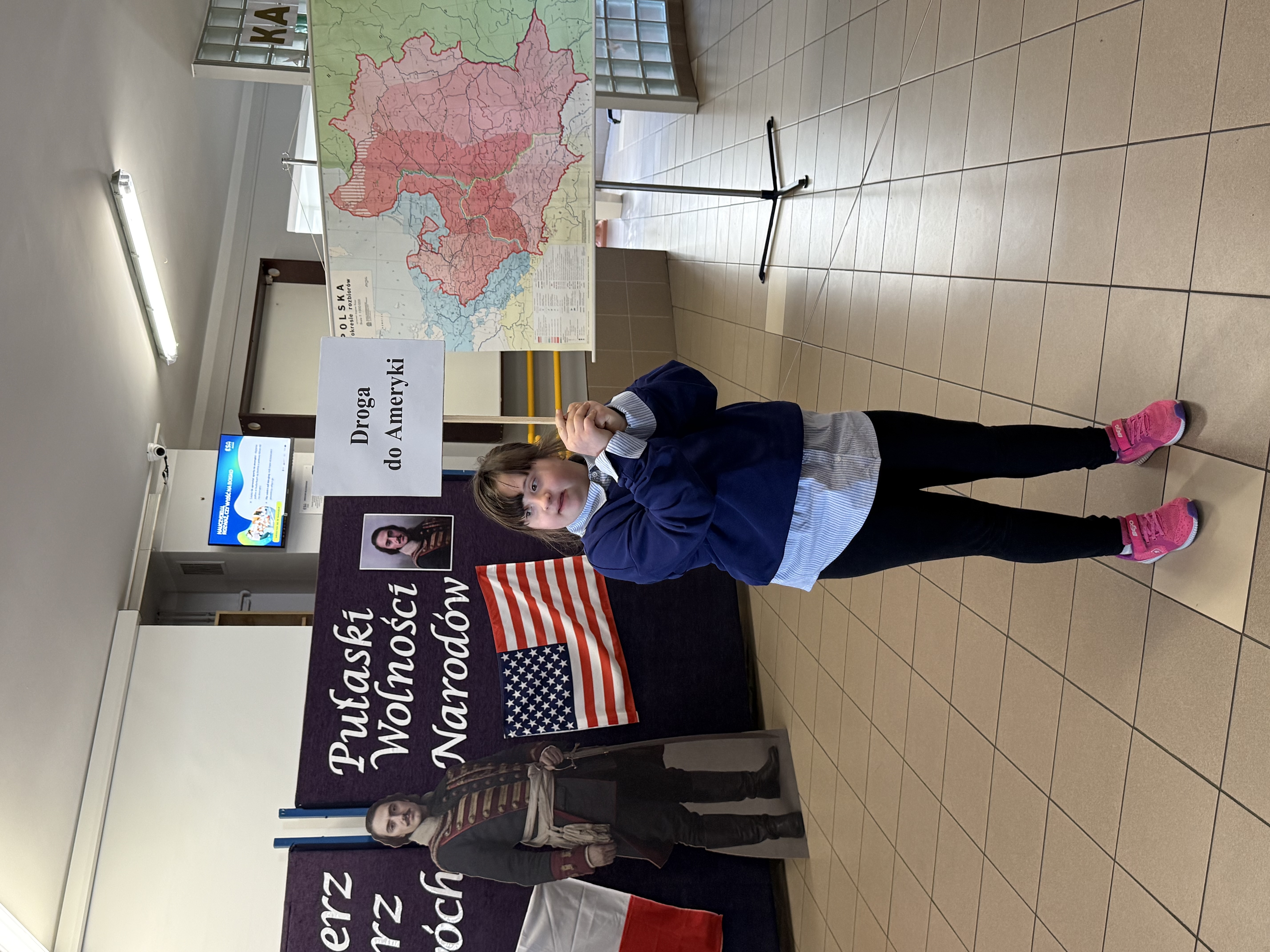 Dziś, w dniu urodzin i imienin naszego patrona – Kazimierza Pułaskiego, odbyła się uroczystość ku Jego czci – Dzień Patrona. Wydarzenie zostało przygotowane przez uczniów klasy V pod kierunkiem wychowawcy. Uroczystość rozpoczęła się od symbolicznego gestu pamięci. Pani Dyrektor wraz z dwojgiem uczniów najmłodszych klas zapaliła znicz pod popiersiem patrona, oddając hołd bohaterowi narodowemu i podkreślając znaczenie jego odwagi oraz poświęcenia dla ojczyzny. Następnie zgromadzeni mieli okazję wysłuchać niezwykłego przemówienia samego Kazimierza Pułaskiego. Dzięki zastosowaniu nowoczesnej technologii AI postać patrona „przemówiła” do uczniów, przybliżając swoją historię oraz wartości, którymi kierował się w życiu – patriotyzm, honor i odwagę. Kolejnym punktem programu był montaż słowno-muzyczny. Młodzi artyści zaprezentowali wiersze i pieśni o tematyce patriotycznej, wprowadzając wszystkich w podniosły i refleksyjny nastrój. Całość dopełniła ciekawa scenografia oraz wspaniałe stroje z epoki, które pozwoliły przenieść się w czasy, w których żył nasz patron. Uroczystość była nie tylko lekcją historii, ale także ważnym przypomnieniem o wartościach, które powinny towarzyszyć nam na co dzień. Dzięki zaangażowaniu uczniów Dzień Patrona stał się pięknym i inspirującym wydarzeniem w życiu naszej szkoły.