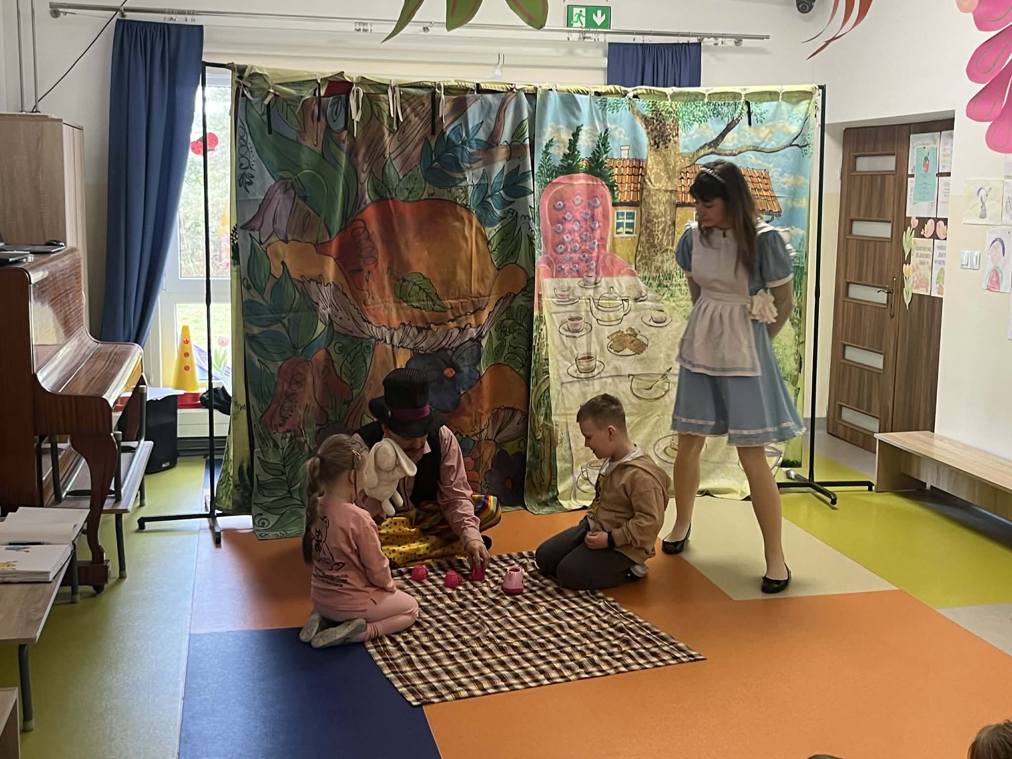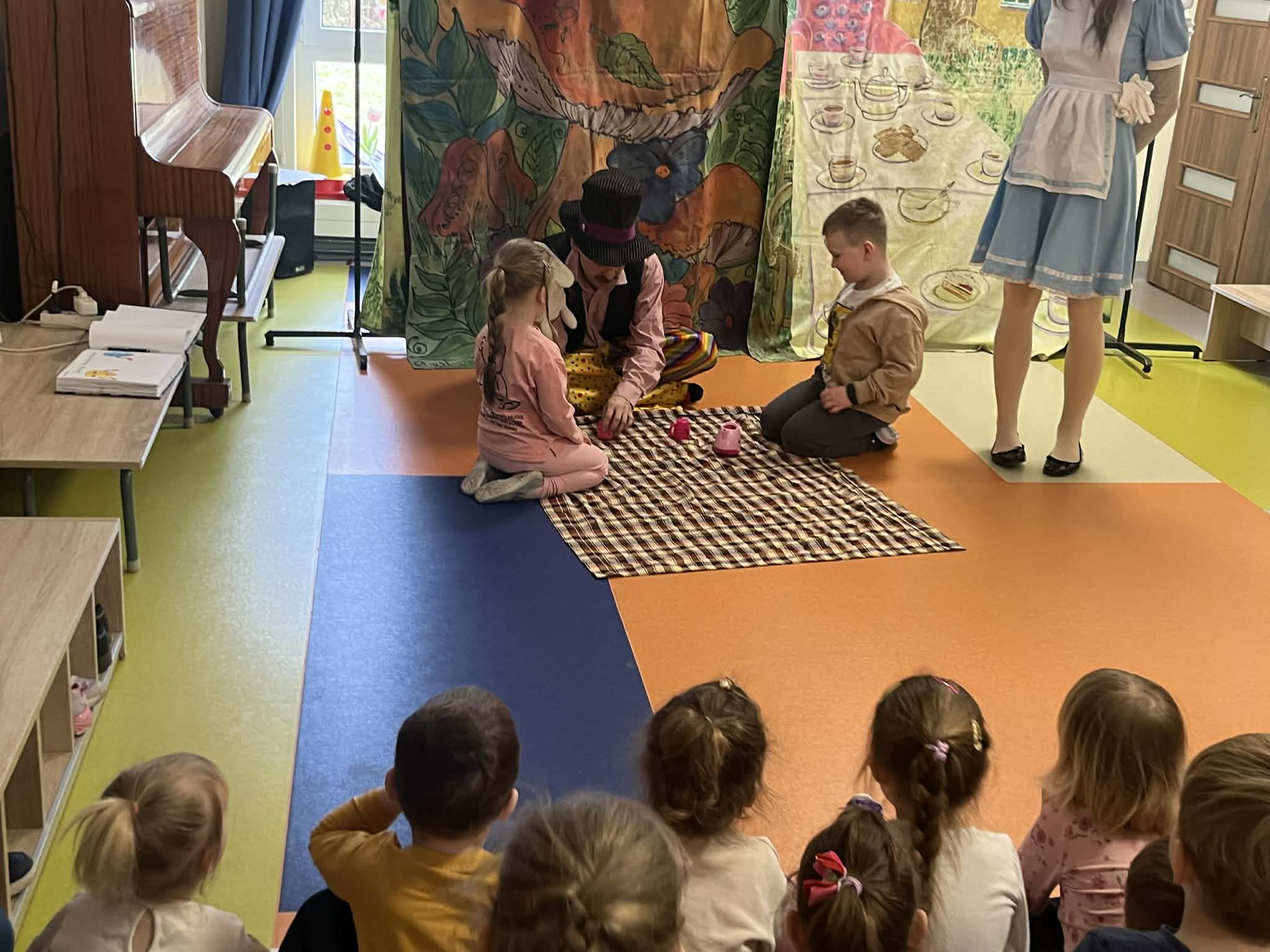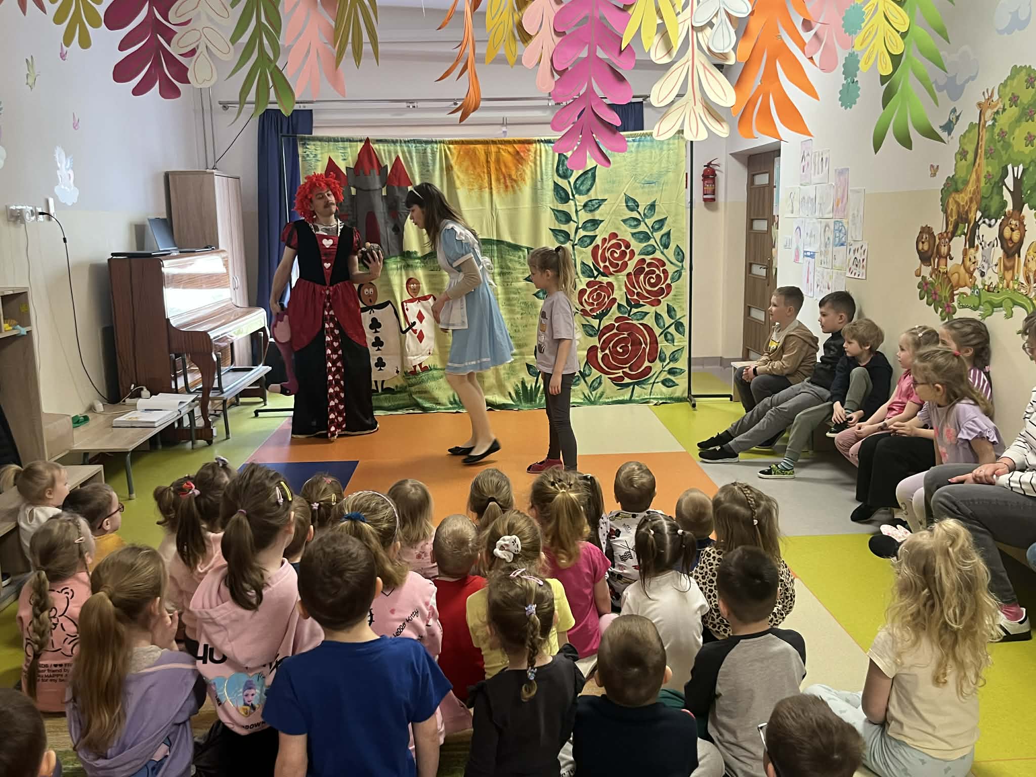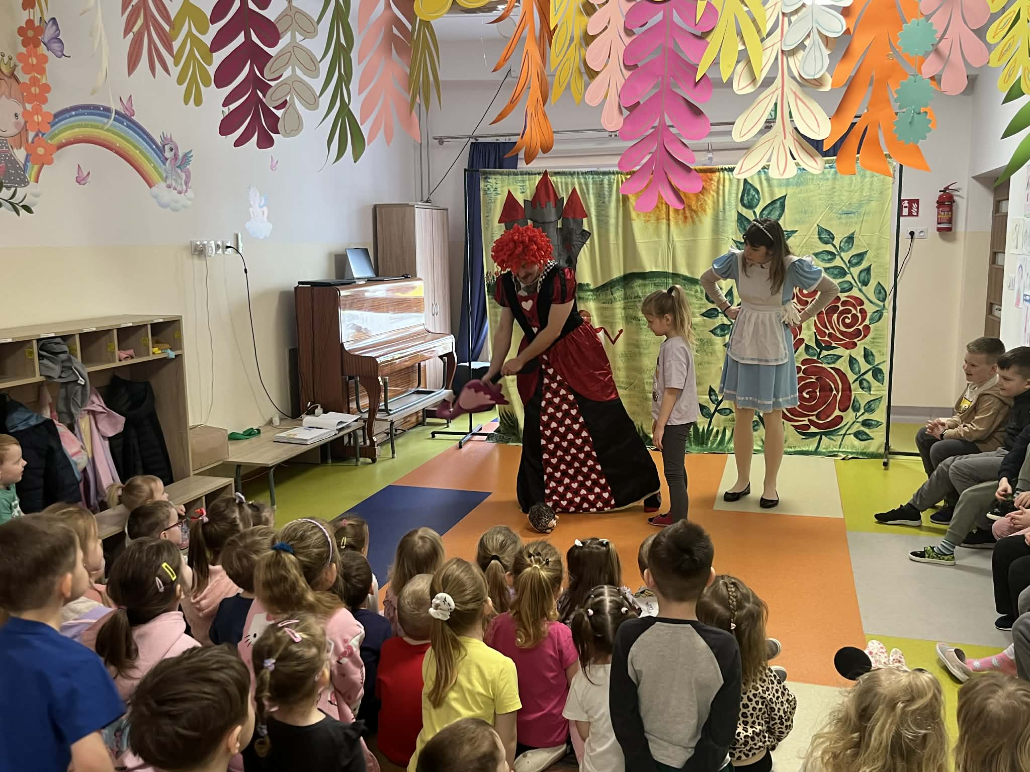 Dziś w naszym przedszkolu mogliśmy uczestniczyć w spektaklu „Alicja w Krainie Czarów” w wykonaniu Teatru Blaszany Bębenek. Była to interaktywna, pełna muzyki i barw adaptacja klasycznej baśni dla dzieci. Opowiadała ona o przygodach Alicji, która podążając za Białym Królikiem trafia do pełnej absurdów krainy, gdzie spotyka Kapelusznika, Kota z Cheshire i Królową Kier, ucząc się wyobraźni. Bawiliśmy się wspaniale!!! Dziękujemy z całego serducha Radzie Rodziców za pomoc w zorganizowaniu tego miłego wydarzenia